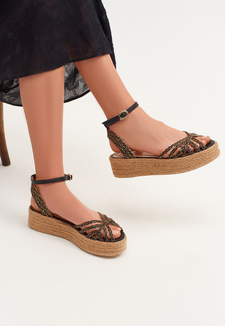 • Bayan Siyah Platform Topuklu Hasır Sandalet