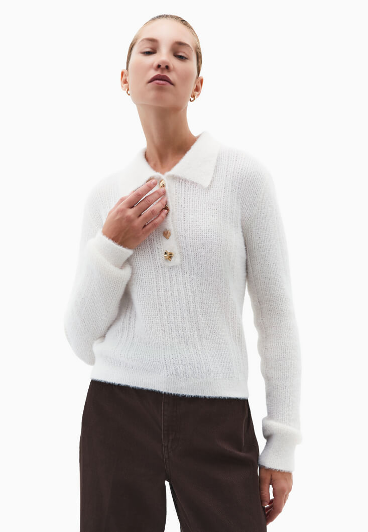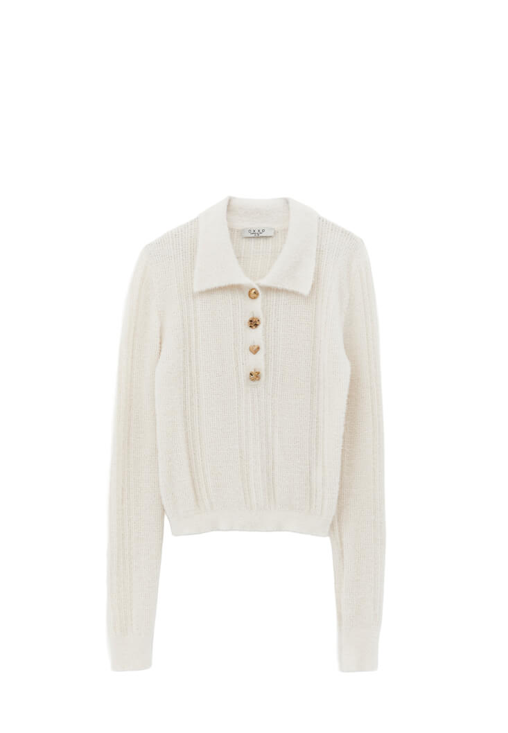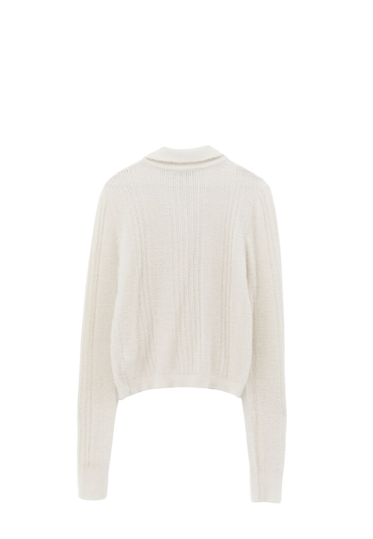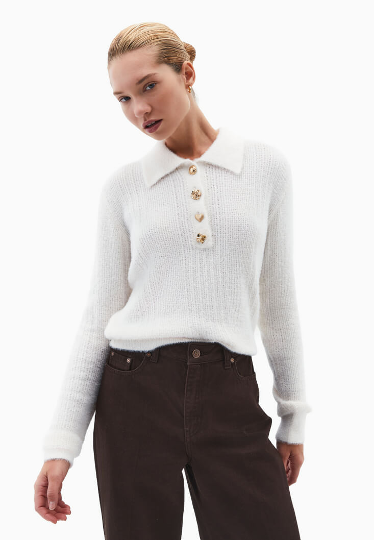 Sakallı ajurlu doku, polo yaka, bedene yakın rahat fit, uzun kollu, yakası düğme detaylı.