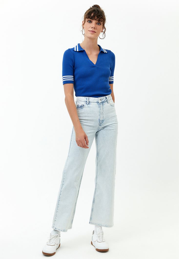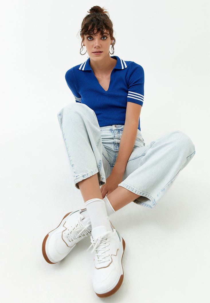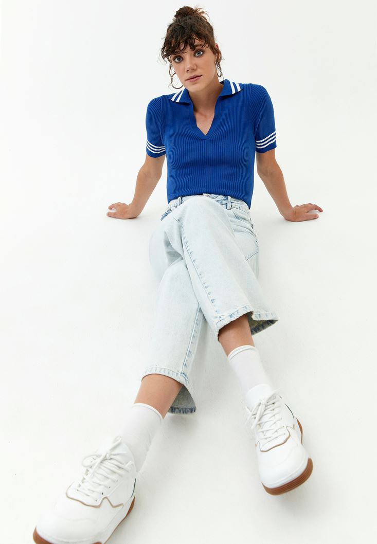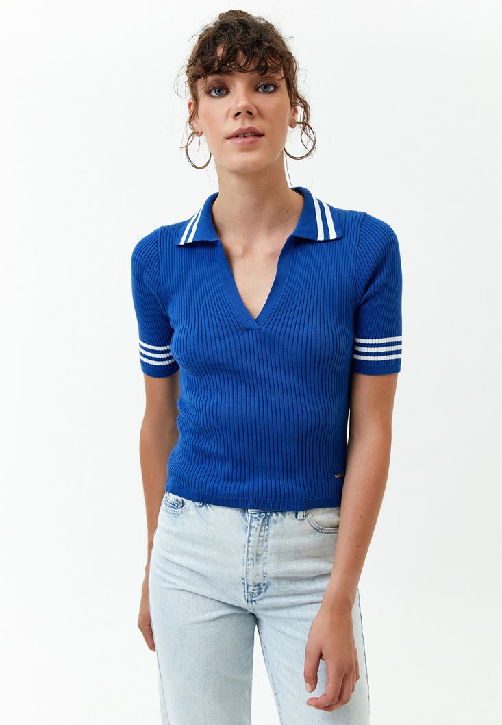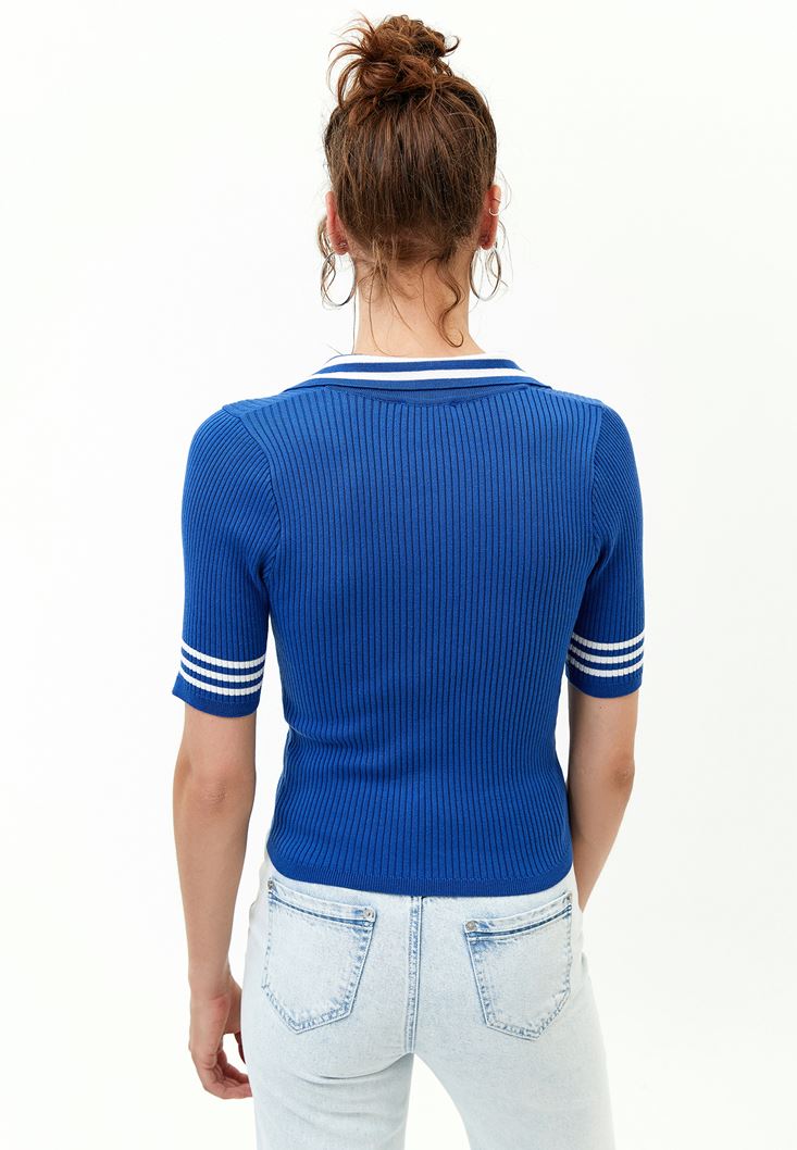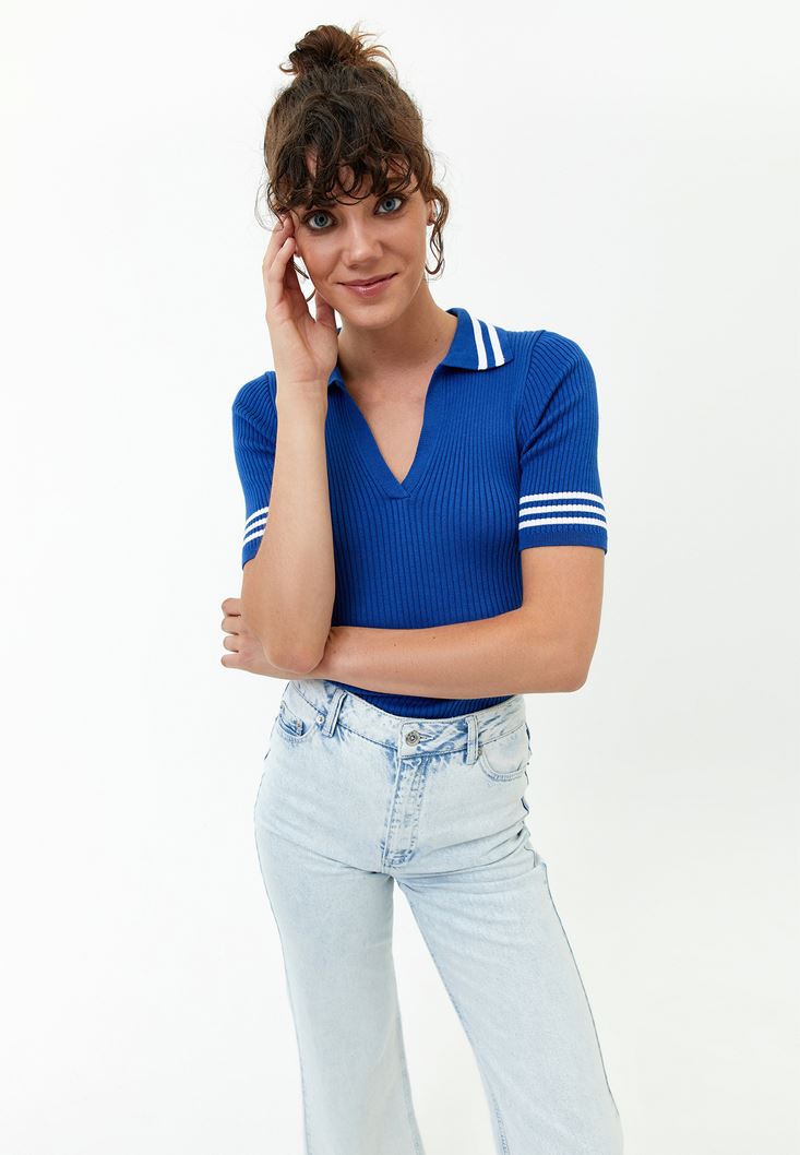 Modal ve pamuk içerikli doğal triko doku, fitilli örgü, yaka ve kol ucu şerit detaylı, kısa kollu, standart boy, polo yaka tasarım, bedeni saran esnek form.