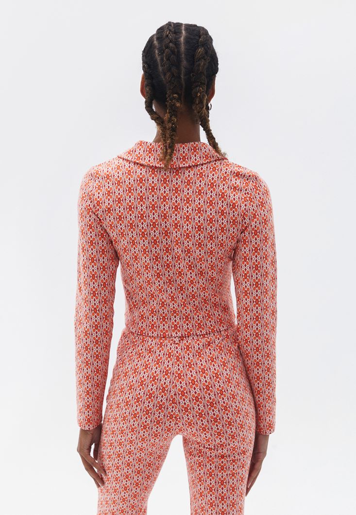 Pamuk ve viskon karışımlı doku, mix desenli, polo yaka, crop kesim, uzun kollu, düğme kapamalı, bedeni saran fit.
