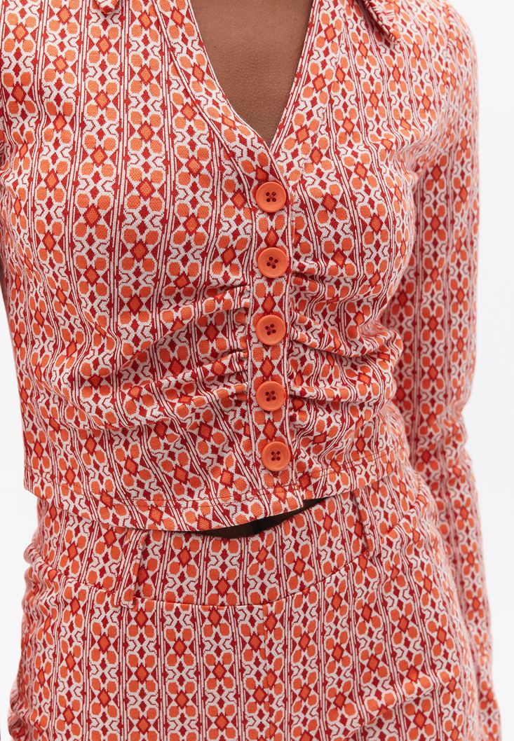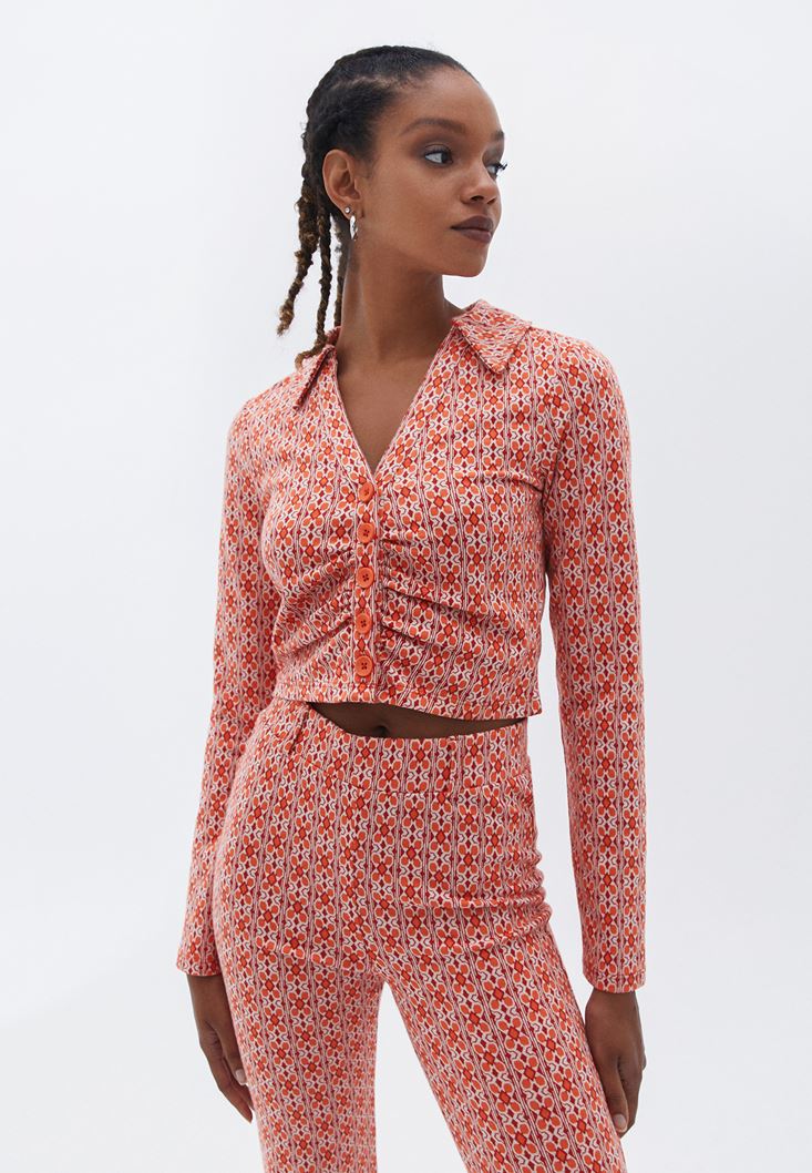 Pamuk ve viskon karışımlı doku, mix desenli, polo yaka, crop kesim, uzun kollu, düğme kapamalı, bedeni saran fit.