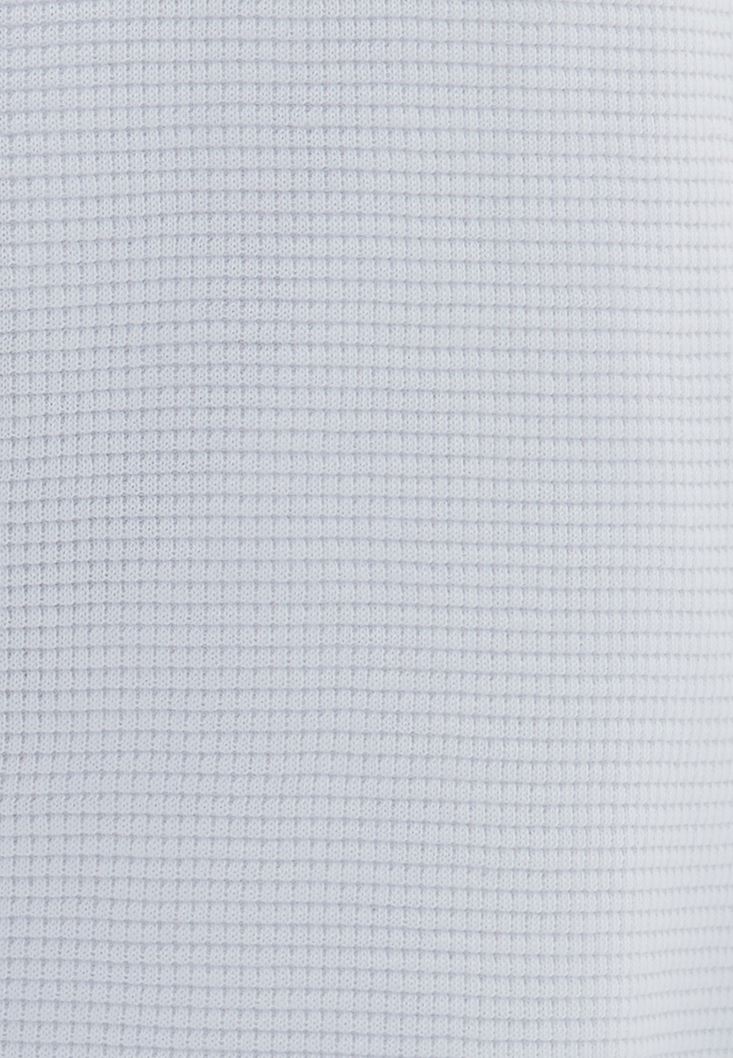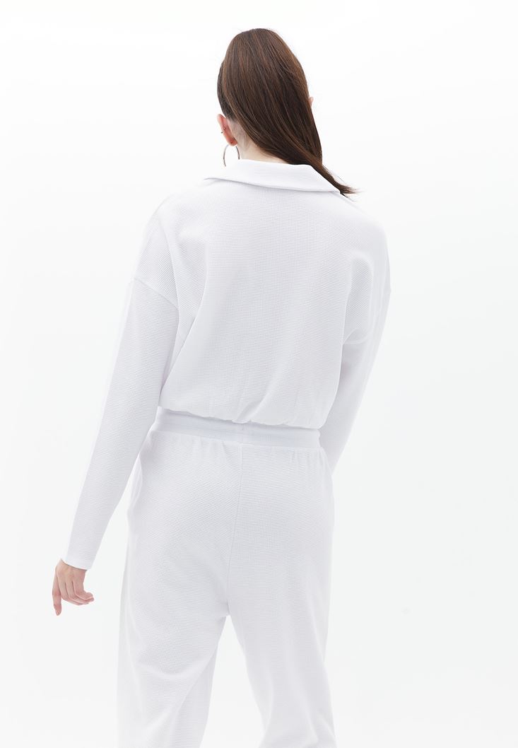 Pamuk karışımlı waffle doku, polo yaka, crop kesim, beli lastikli, bedenden uzak rahat fit, uzun kollu.