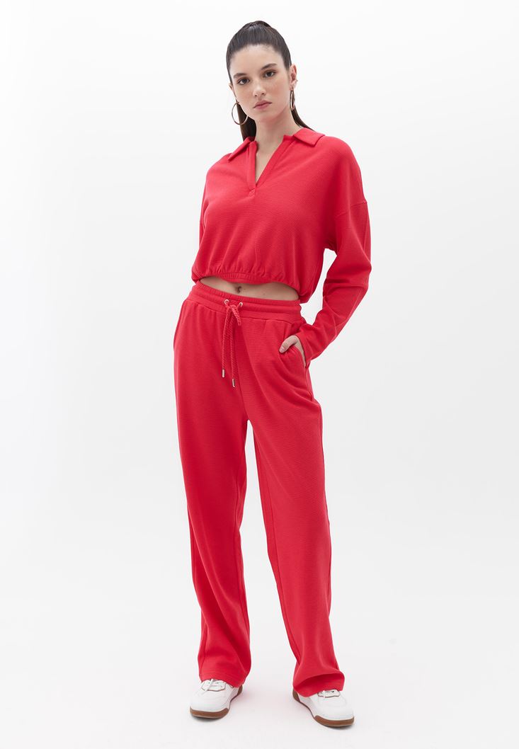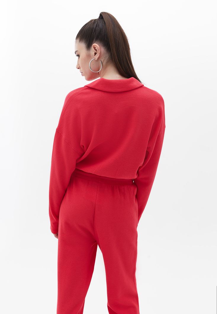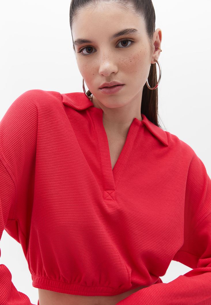 Pamuk karışımlı waffle doku, polo yaka, crop kesim, beli lastikli, bedenden uzak rahat fit, uzun kollu.