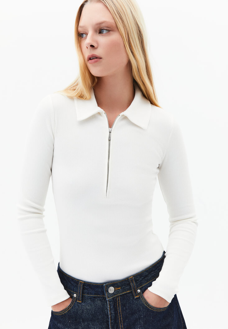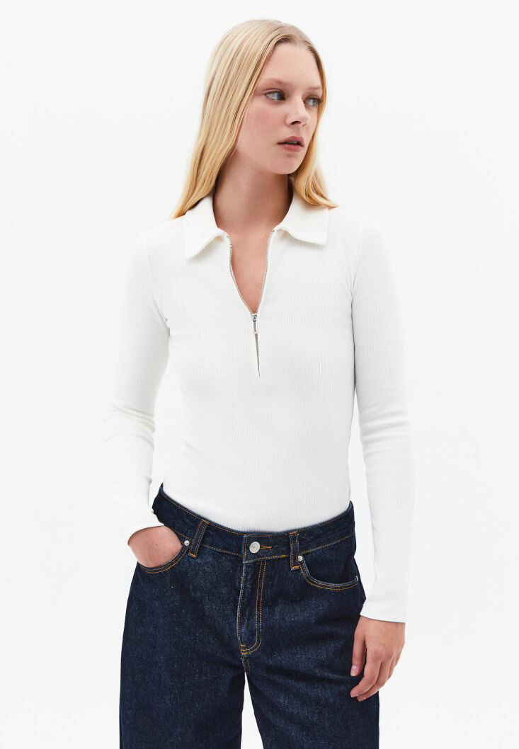 Pamuk karışımlı içerik, bedeni saran esnek fit, jakarlı doku, fermuarlı polo yaka, uzun kollu.