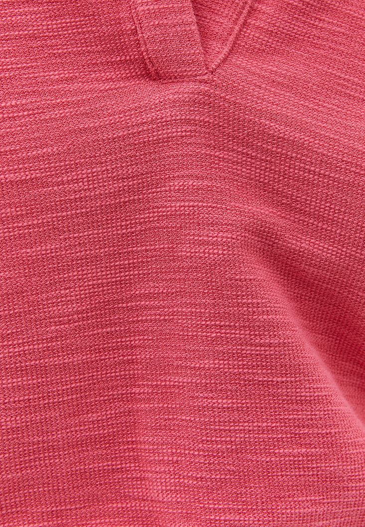 Pamuk karışımlı doku, crop kesim, beli lastikli, polo yaka, kısa kollu, bedene yakın rahat fit.