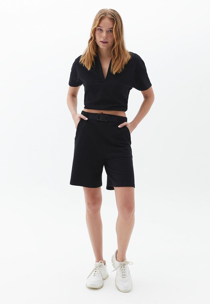 Pamuk karışımlı doku, crop kesim, beli lastikli, polo yaka, kısa kollu, bedene yakın rahat fit.