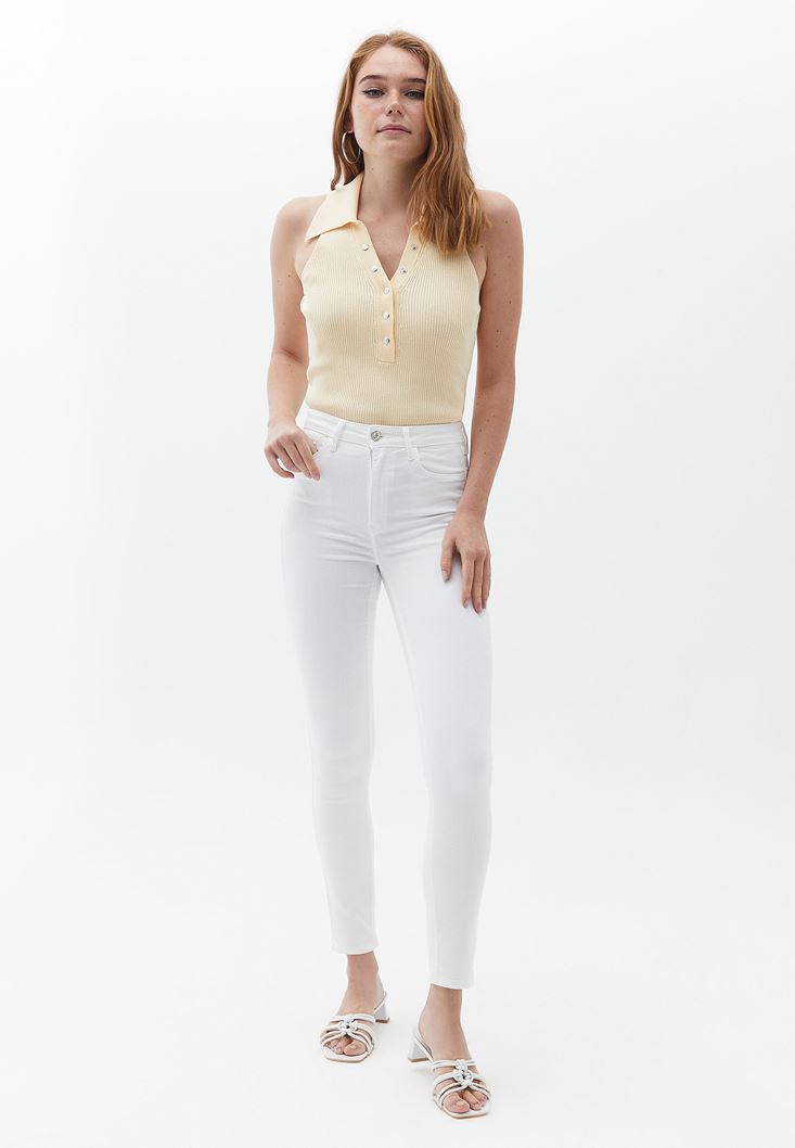 Viskon karışımlı triko, polo yaka, bedeni saran fit, yakası çıtçıt kapamalı, kolsuz tasarım, standart boy.