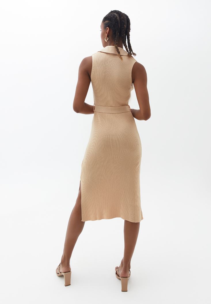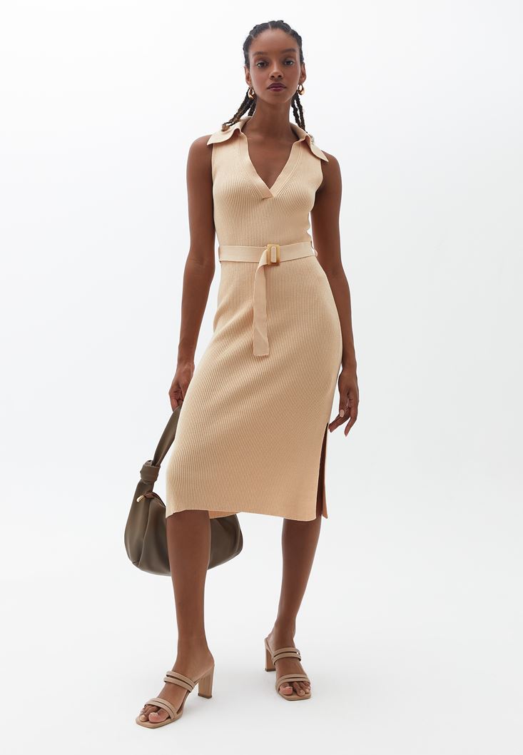 Viskon karışımlı fitilli örgü, polo yaka form, bedeni saran esnek fit, midi boy, kendi kumaşından kemerli, yan kısmı tek yırtmaçlı.