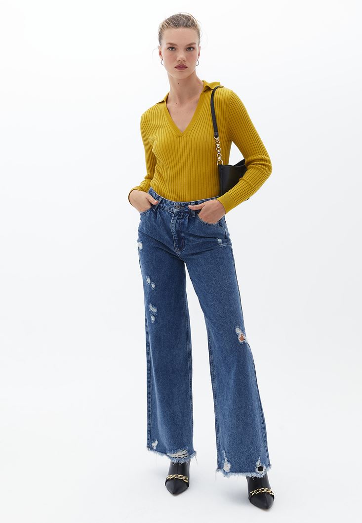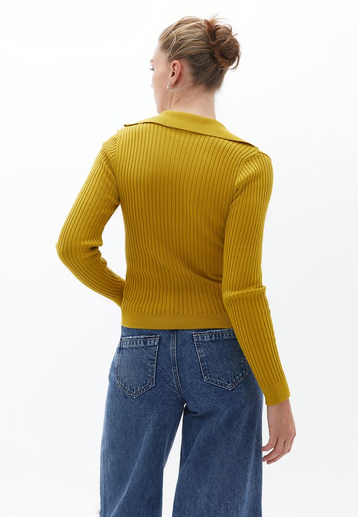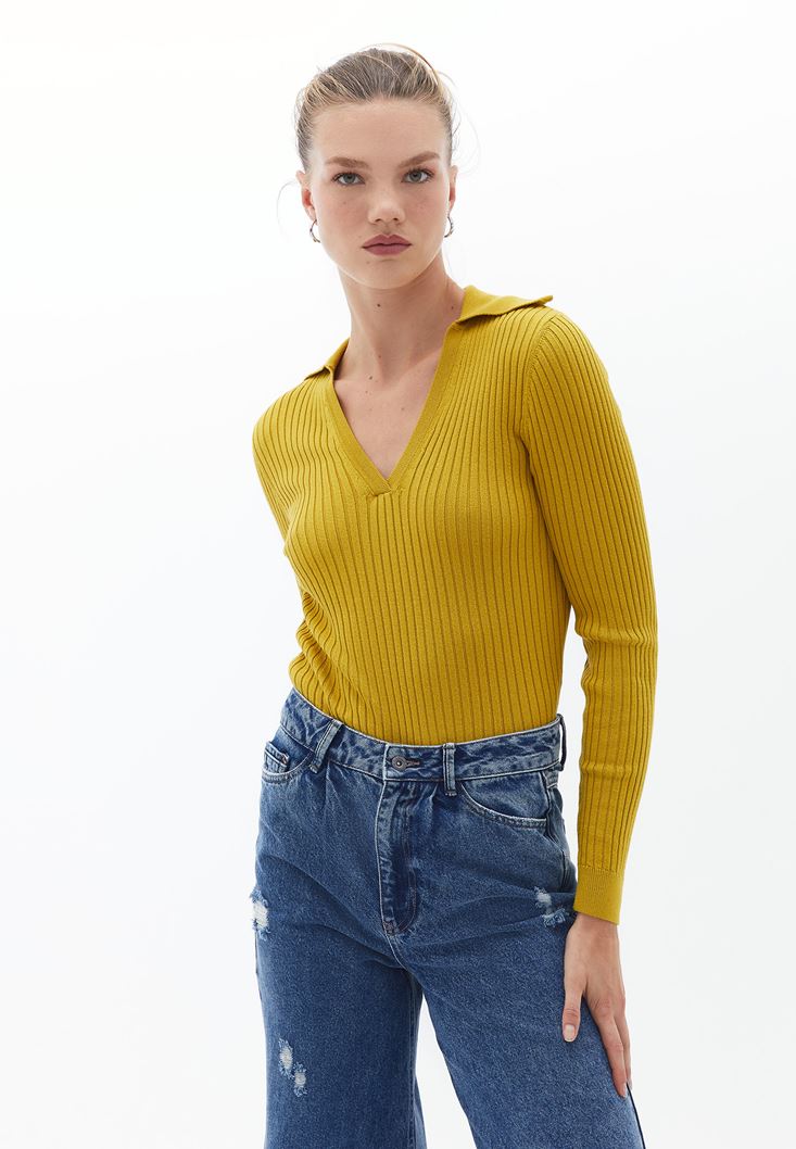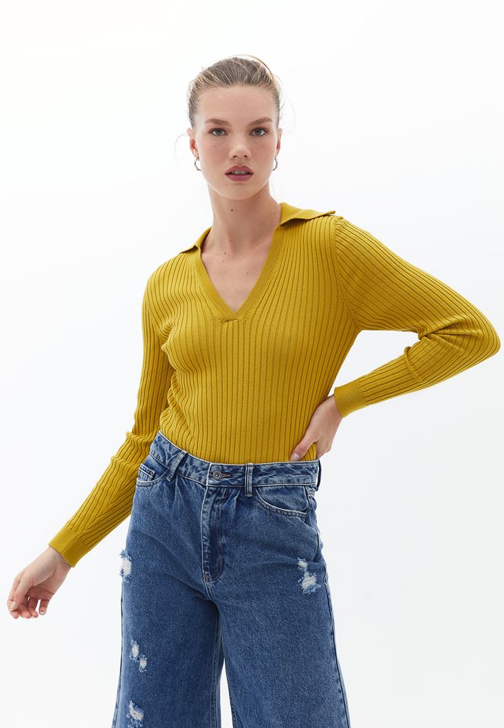 Viskon karışımlı örgü, polo yaka, uzun kollu, bedeni saran esnek fit, standart boy.