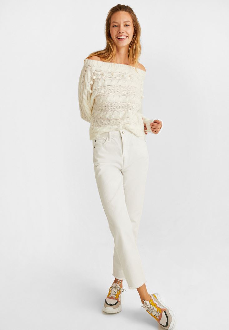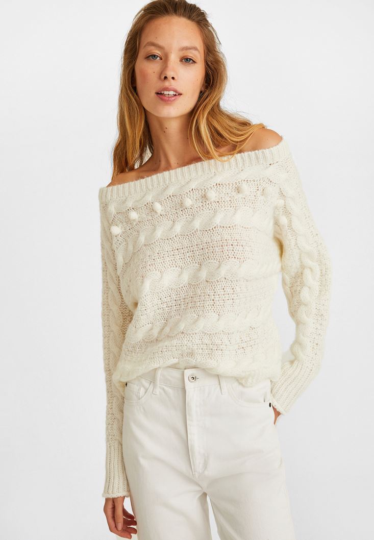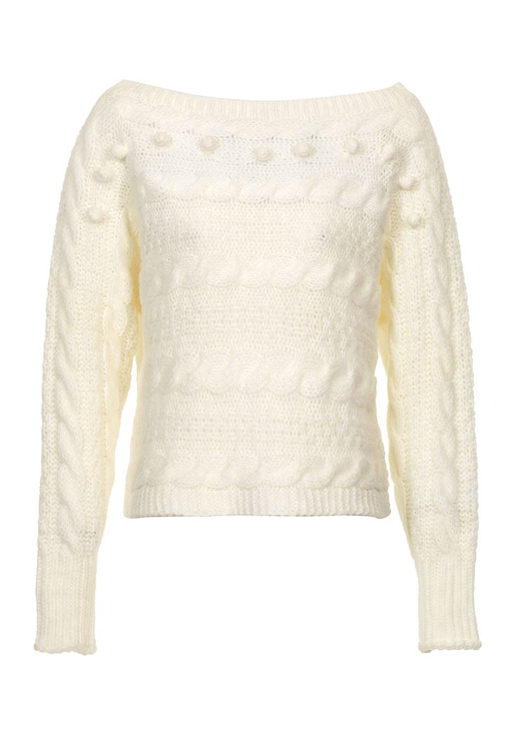 Krem Ponpon Detaylı Düşük Omuz Kazak