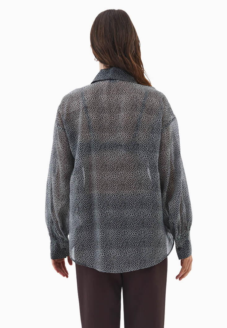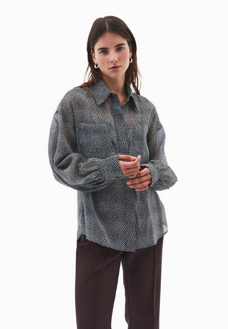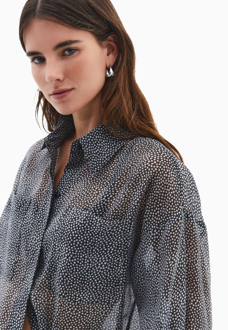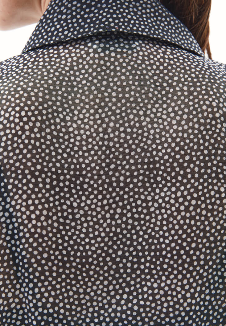 Tencel(Lyocell) karışımlı özel doku, bedenden uzak loose fit, puantiye desenli, önü kısa arkası uzun asimetrik kesim, üst kısmı iki cepli, hafif transparan doku.