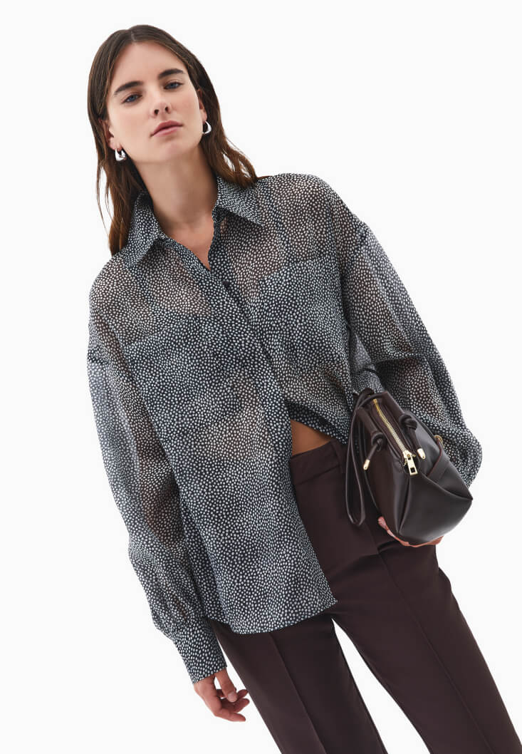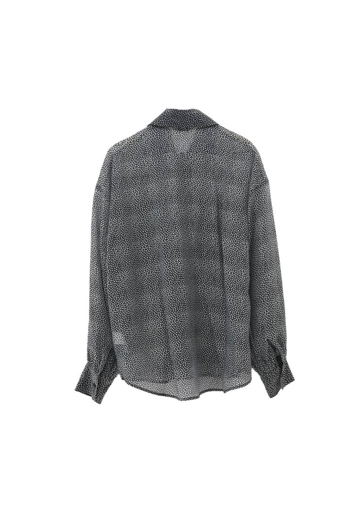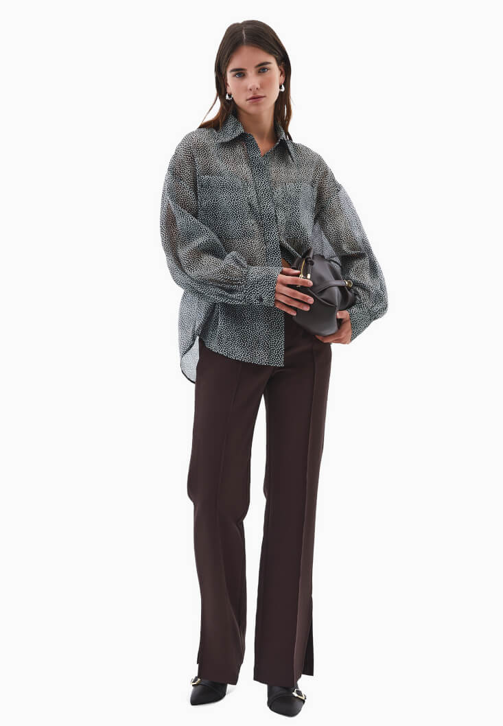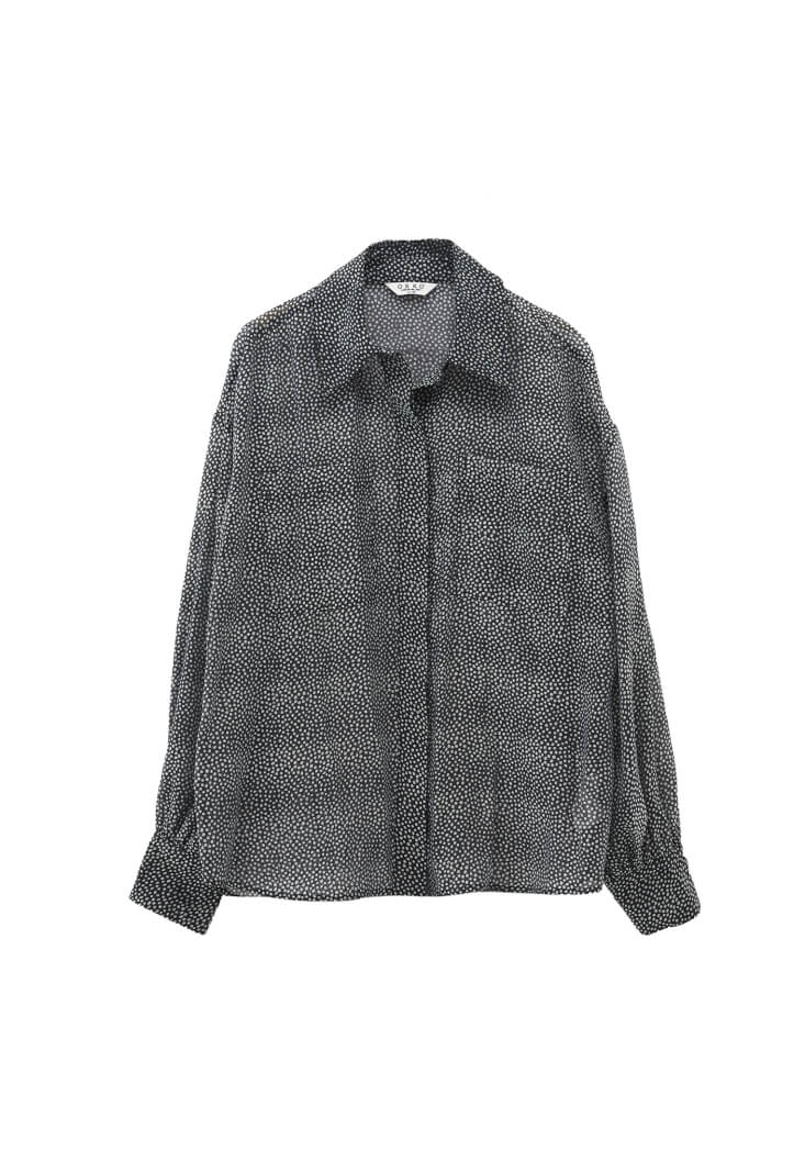 Tencel(Lyocell) karışımlı özel doku, bedenden uzak loose fit, puantiye desenli, önü kısa arkası uzun asimetrik kesim, üst kısmı iki cepli, hafif transparan doku.