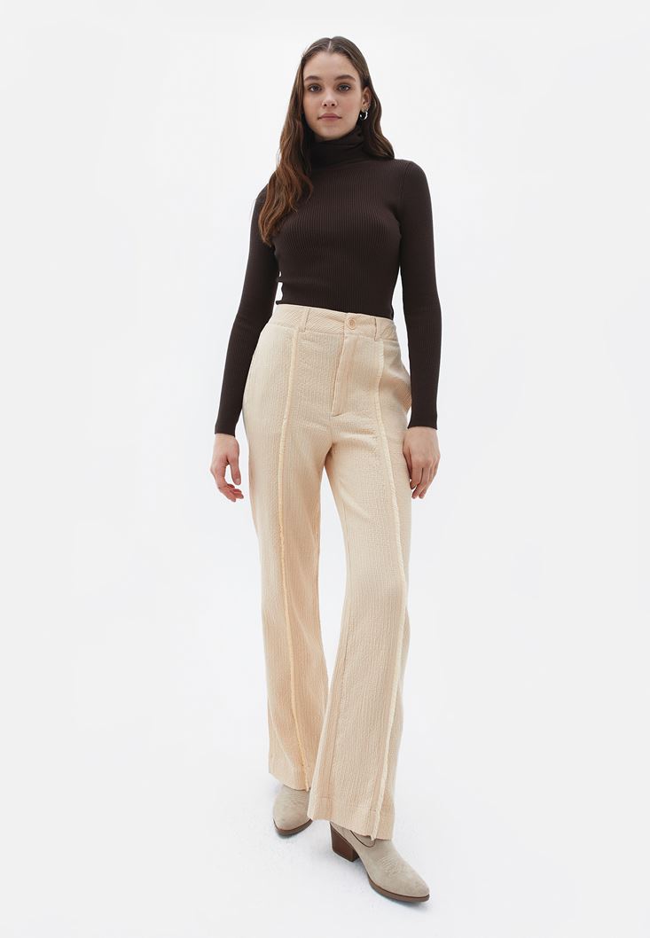Pamuk karışımlı özel doku, ultra yüksek bel, bedenden uzak wide fit, ön kısmı iki cepli, ön beden boyu püsküllü dikiş detaylı.