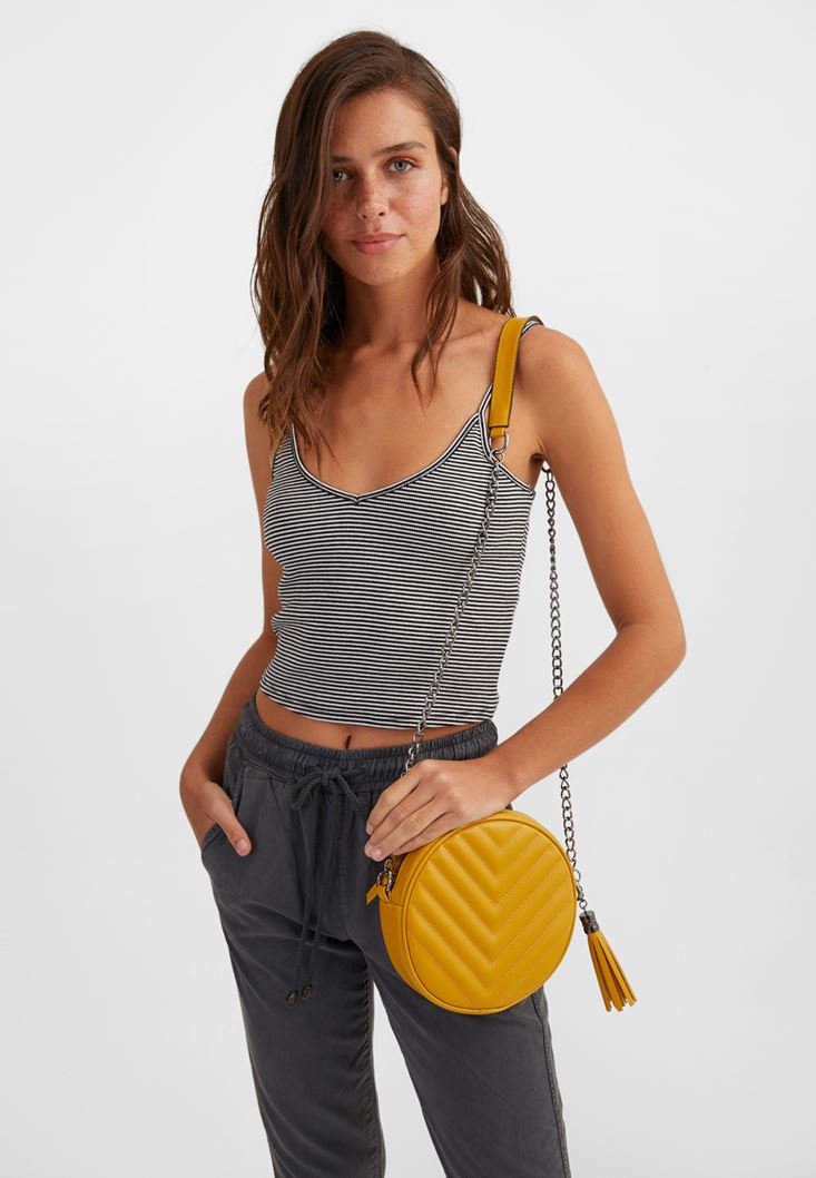 Püsküllü Askılı Çanta modeli askısında kullanılan suni deri ve metal zincir detayı ile hoş bir görünüm kazanan askılı çantayı kombinlerinizde çok severek kullanacaksınız. Yuvarlak forma sahip kadın askılı çanta modeli kullanılan püskül detayı ile hareketlendirilmiş spor ve şıklığı bir arada sunan kadın çanta modeli. OXXO'nun ruhunu ve enerjisini yansıtan küçük çanta modellerinden birisi.