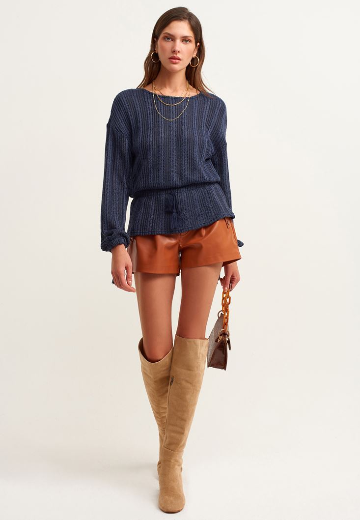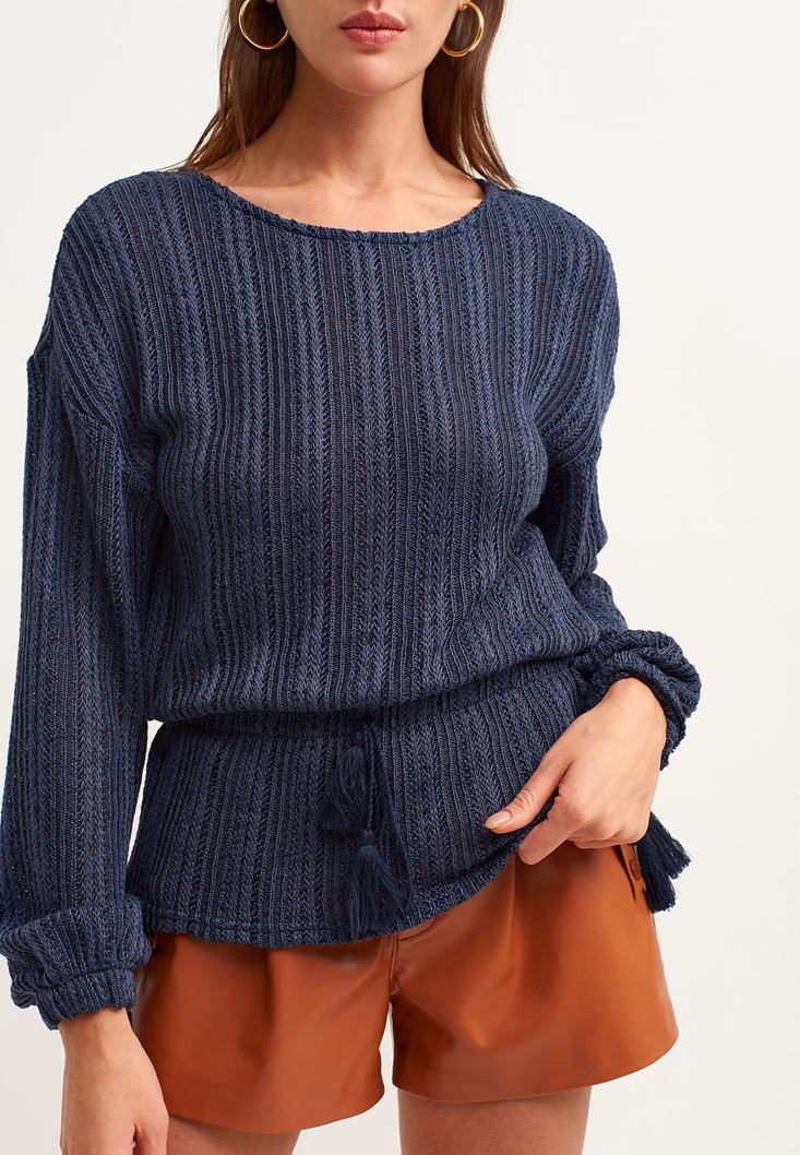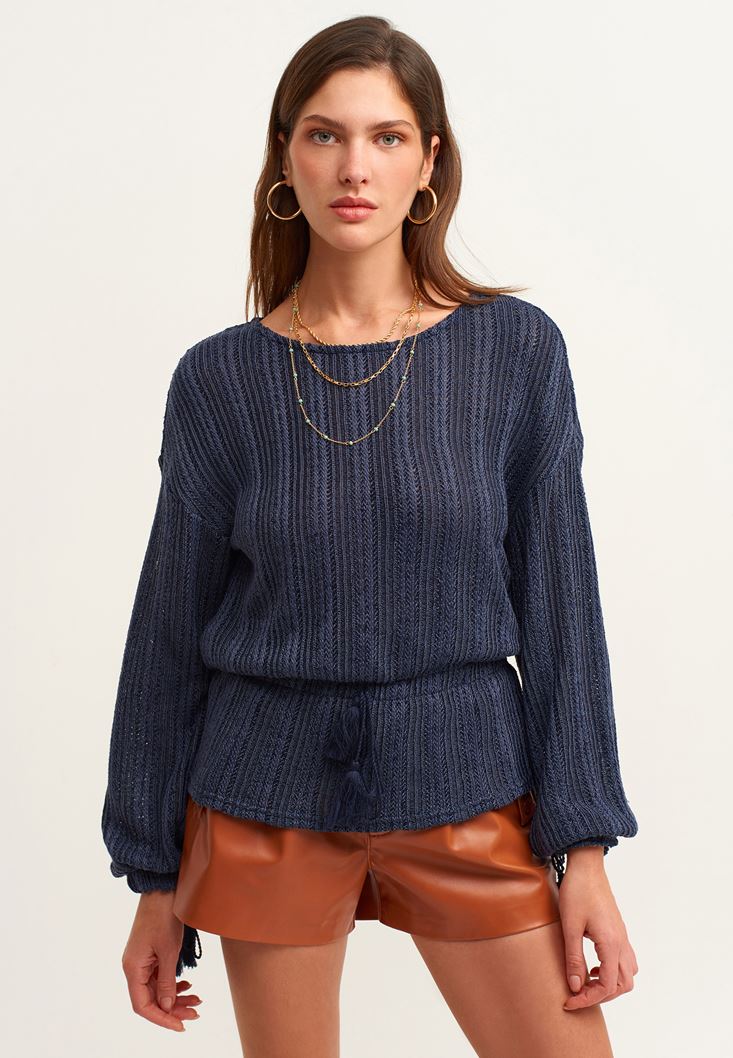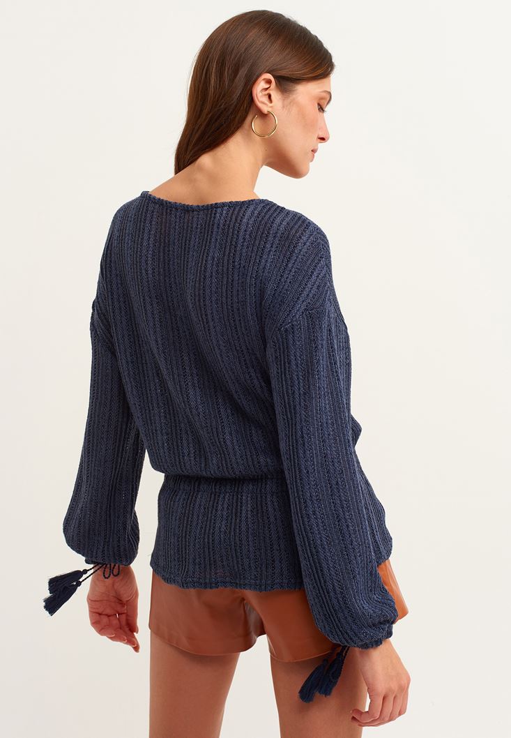 Lacivert Püsküllü Balon Kol Bluz