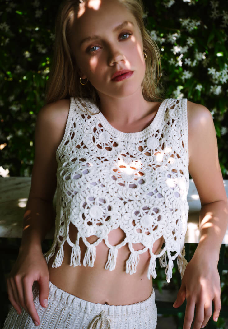 Özel tığ işi örgüsüyle dikkat çeken bu crop atlet, püskül detaylarıyla bohem tarzı modern bir yorumla buluşturuyor. Vücuda yakın yapısıyla feminen bir duruş sunarken, özgün dokusuyla stilinizi farklılaştırıyor.