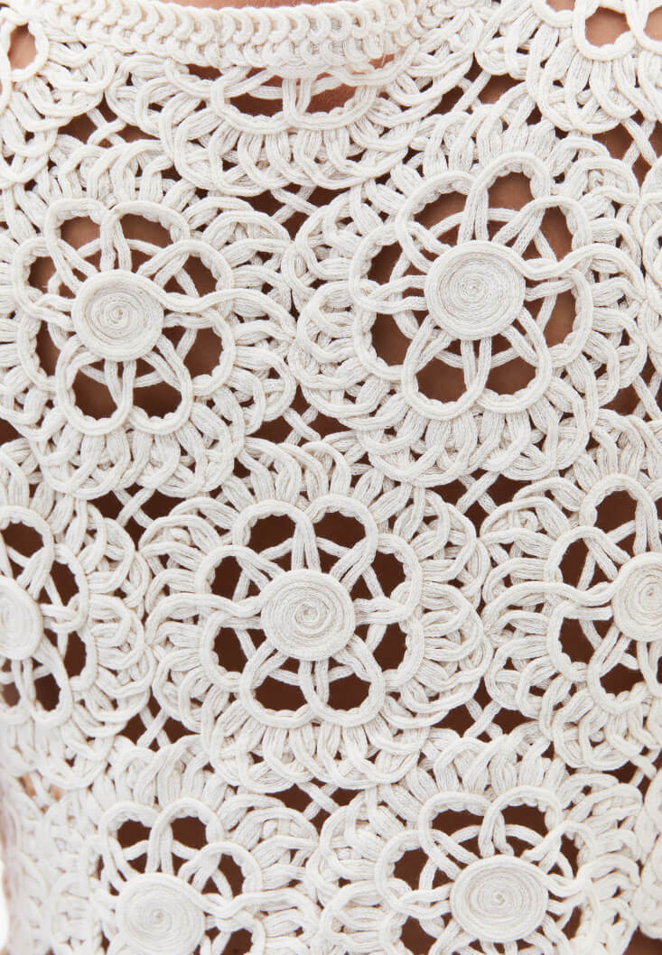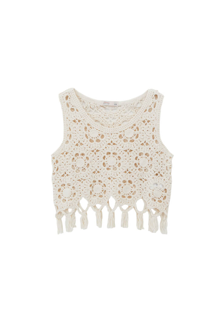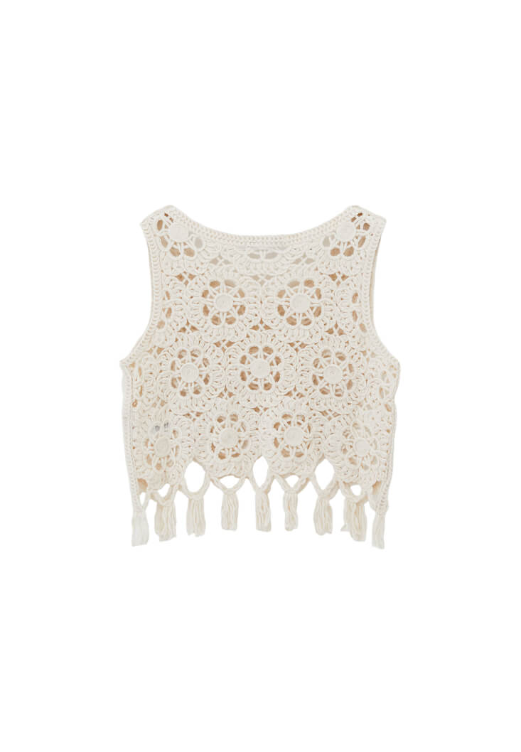 Pamuk karışımlı tığ işi örgü, bedene yakın rahat fit, motifli örgü, bel kısmı püskül detaylı, crop kesim, sıfır yaka.