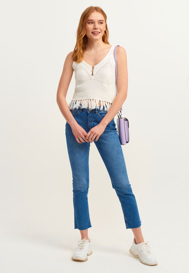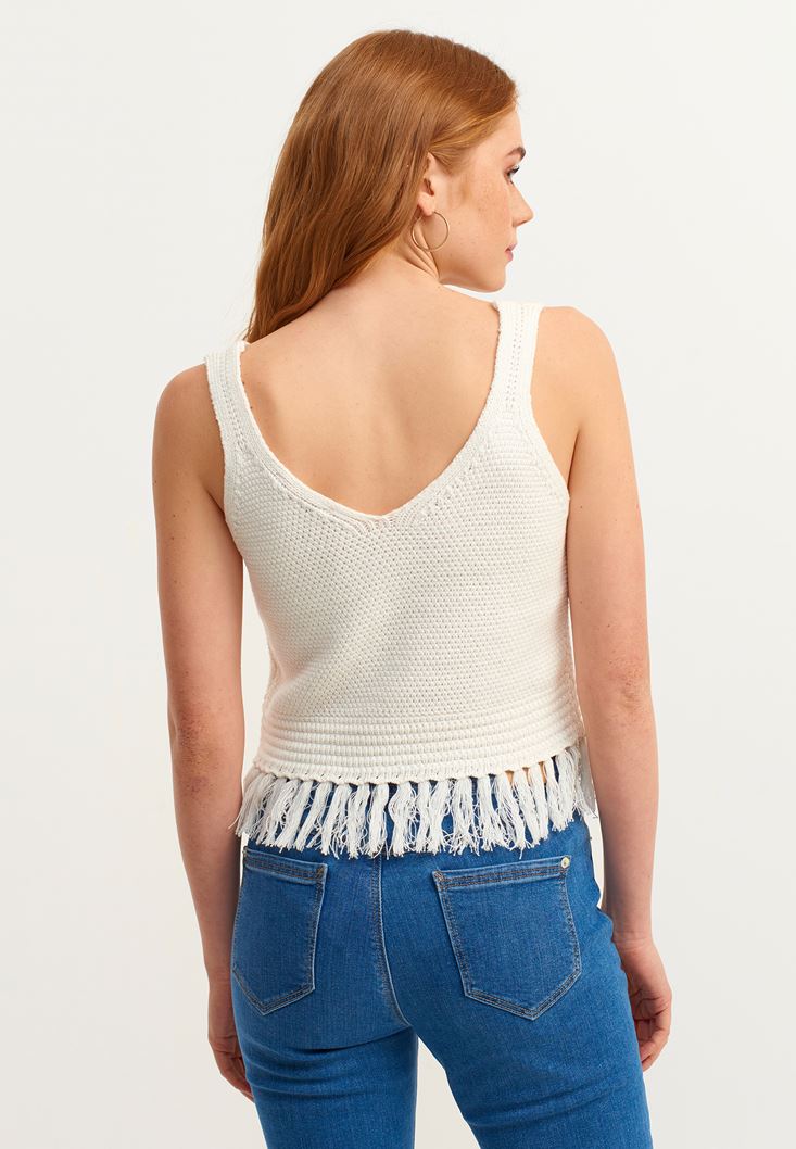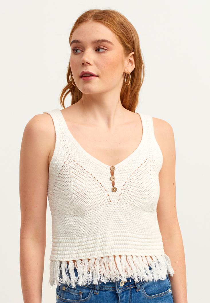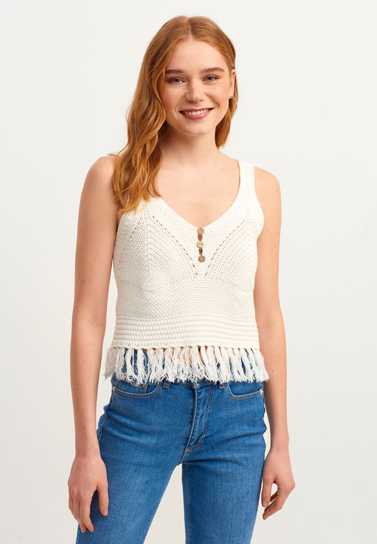 Pamuk karışımlı örgülü doku, düğme detaylı, ajurlu örme, bel kısmı püsküllü, crop kesim, kalın askılı form.