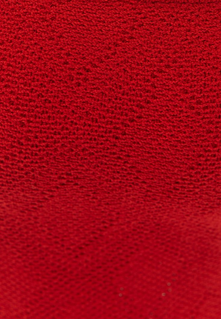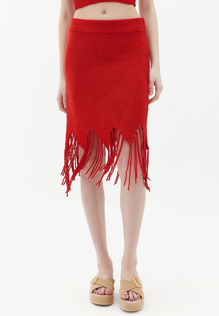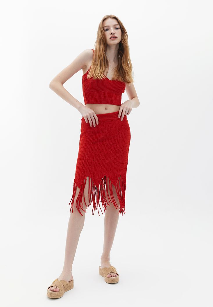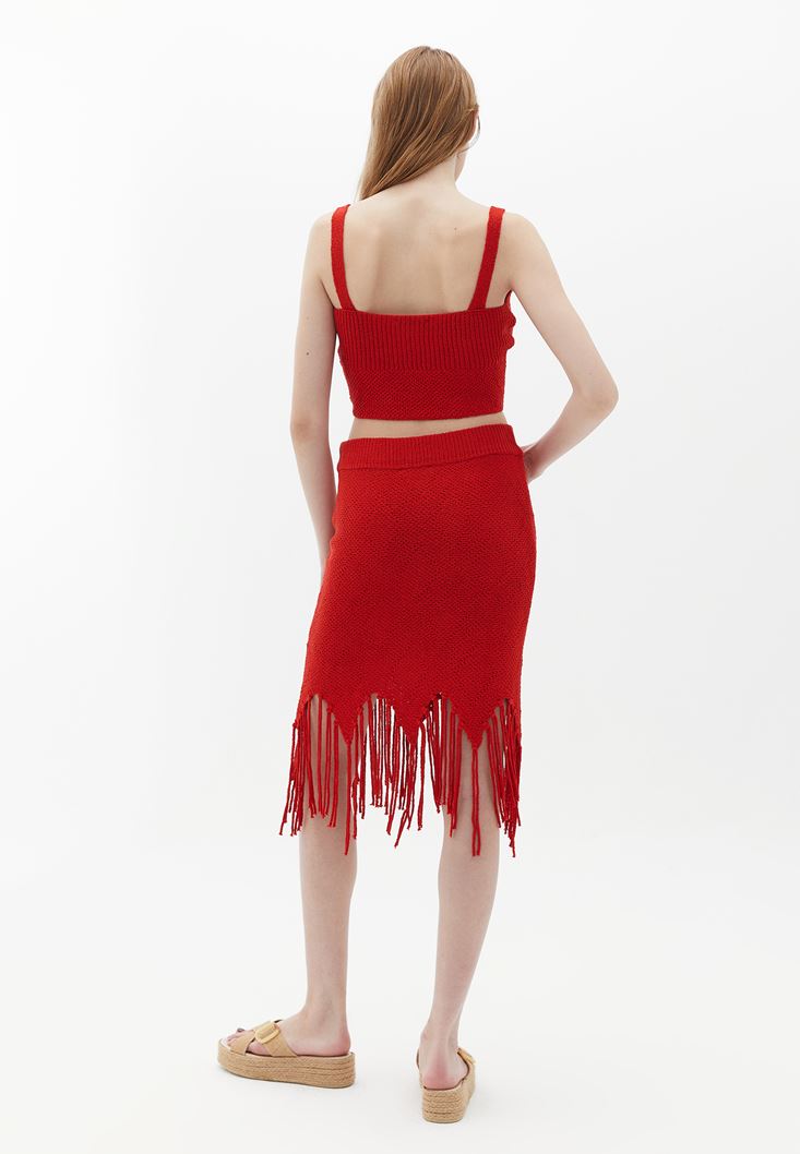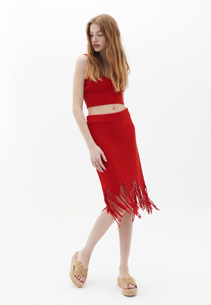 Triko örgü, yüksek bel, bedeni saran esnek fit, beli lastikli, etek ucu asimetrik kesim ve püsküllü, kısa boy kesim.