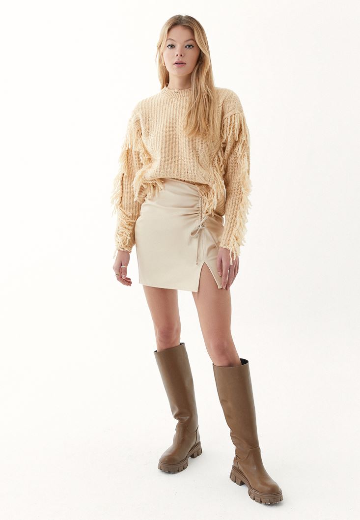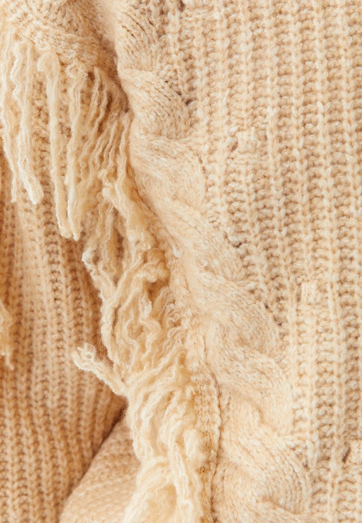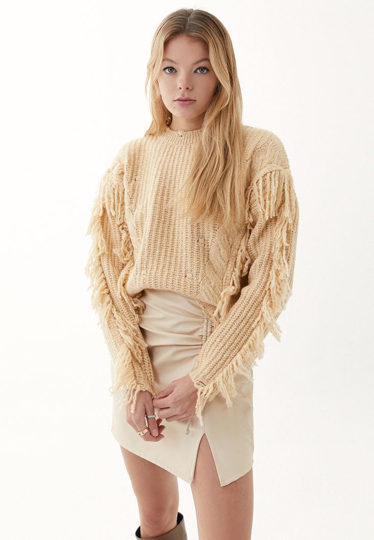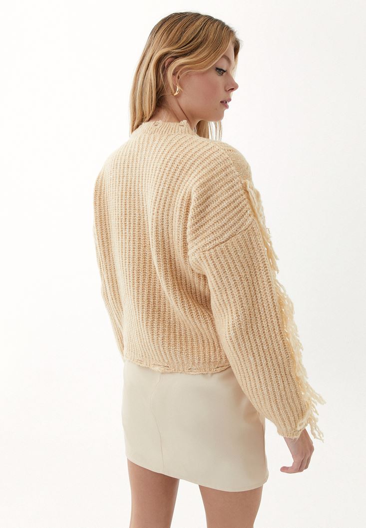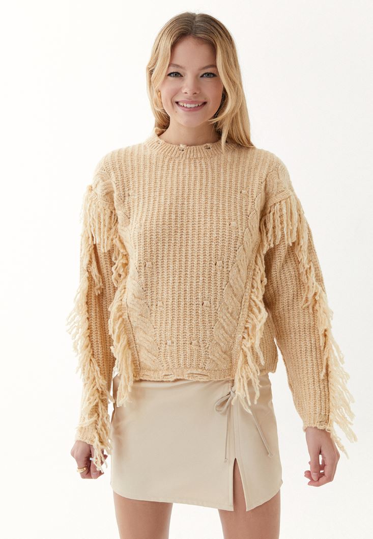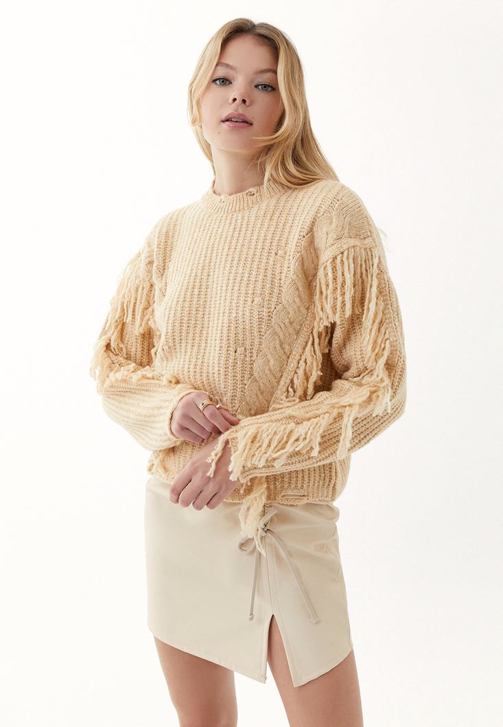 Pamuk karışımlı triko, kol ve ön kısmı püskül detaylı, ön kısmı saç örgülü, bedene yakın rahat fit, uzun kollu, sıfır yaka, standart boy.