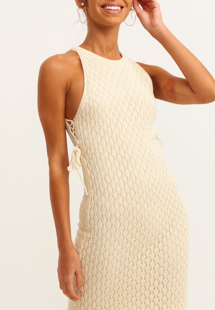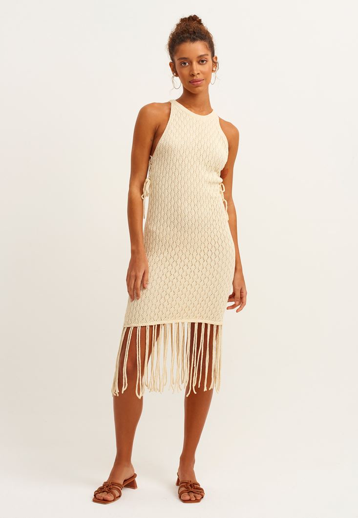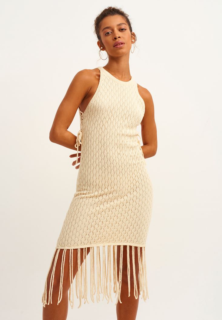 Ajurlu örme detaylı, halter yaka, yan kısımları bağcık ayrıntılı, etek ucu püsküllü, bedeni saran rahat kalıp, mini boy.