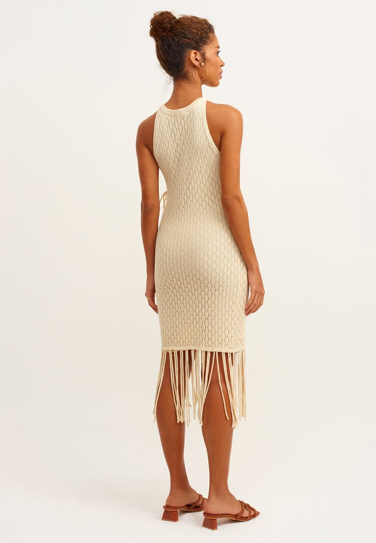 Kum Beji Püsküllü ve Ajurlu Mini Elbise