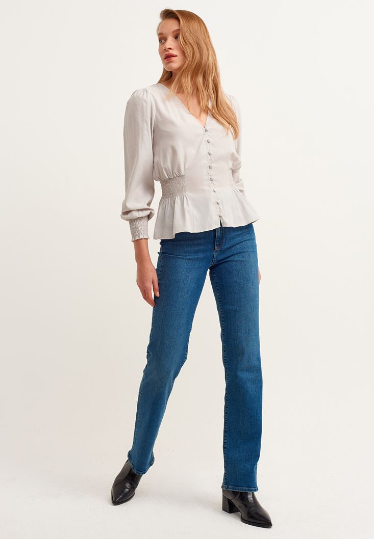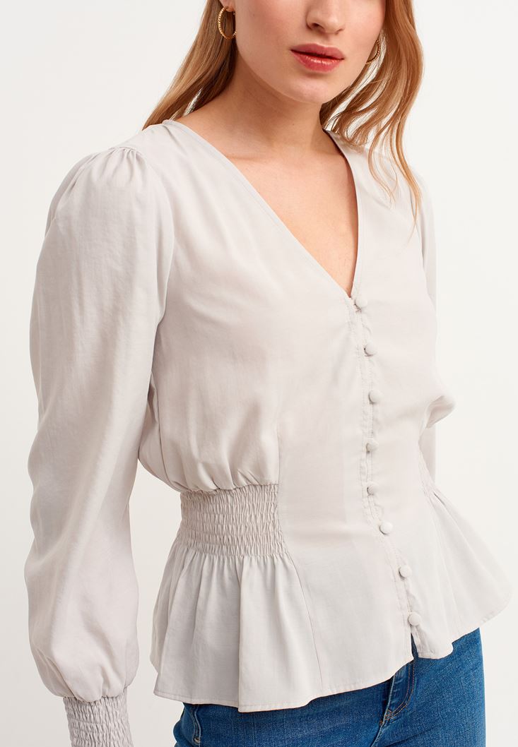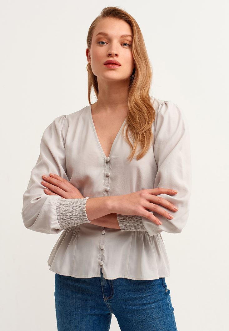 Balon kollu, bel ve bilek kısmı gipeli, önden düğmeli tasarım, beli saran duruş.