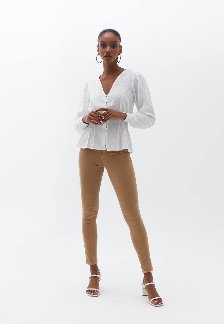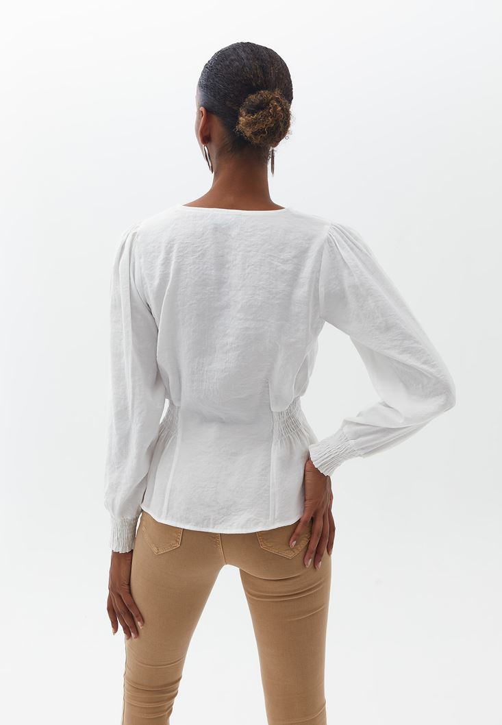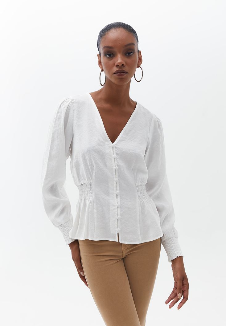 Modal karışımlı özel doku, V yaka, ön kısmı kendi kumaşından düğmeli, balon kollu, beli ve kol ucu gipeli.