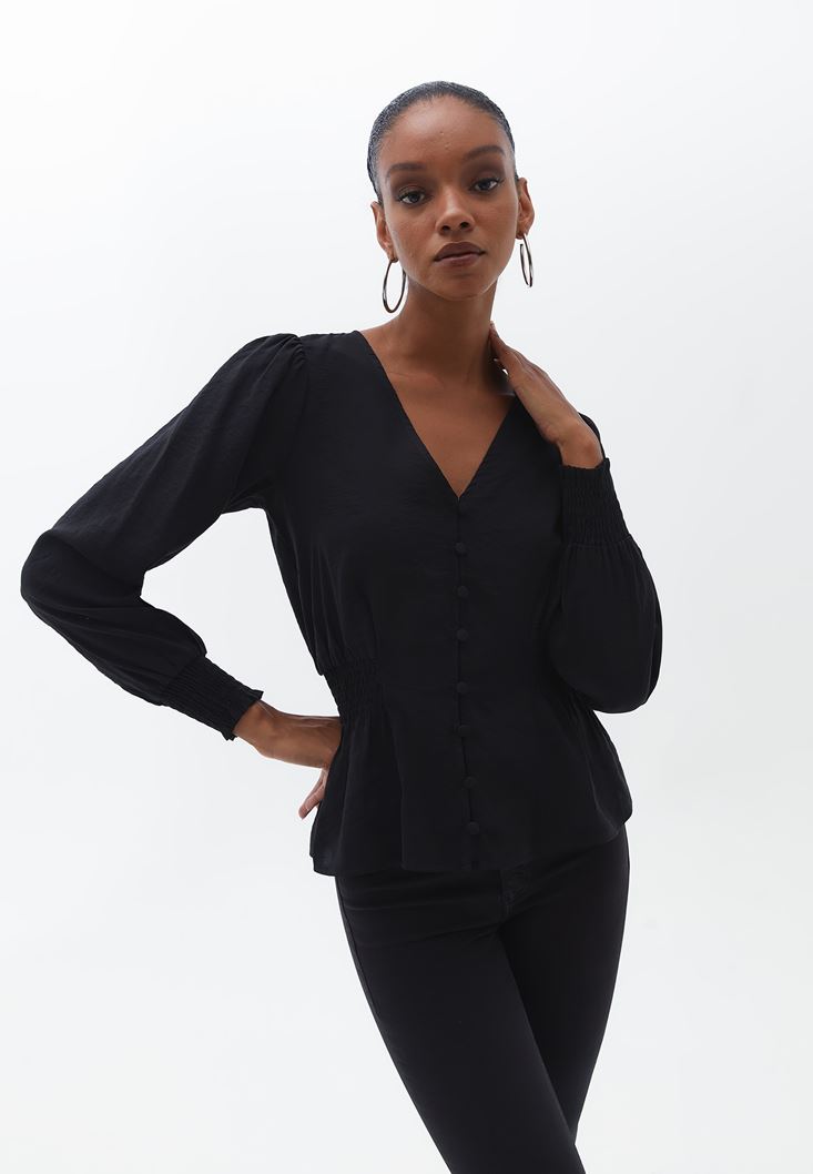 Modal karışımlı özel doku, V yaka, ön kısmı kendi kumaşından düğmeli, balon kollu, beli ve kol ucu gipeli.