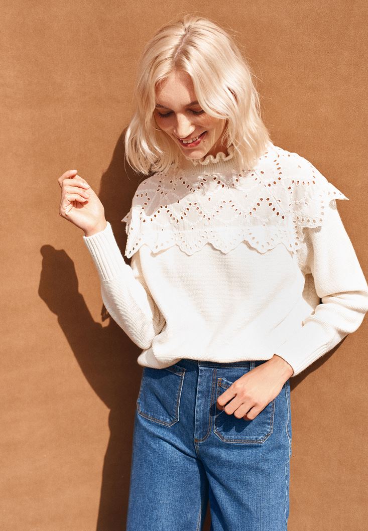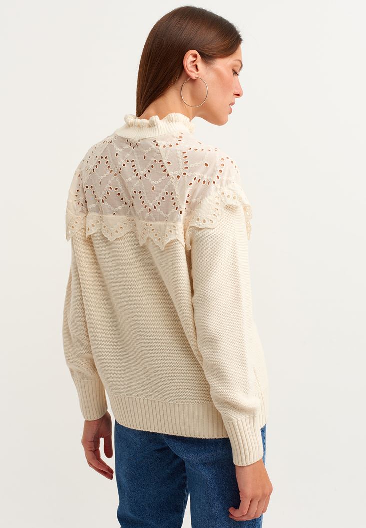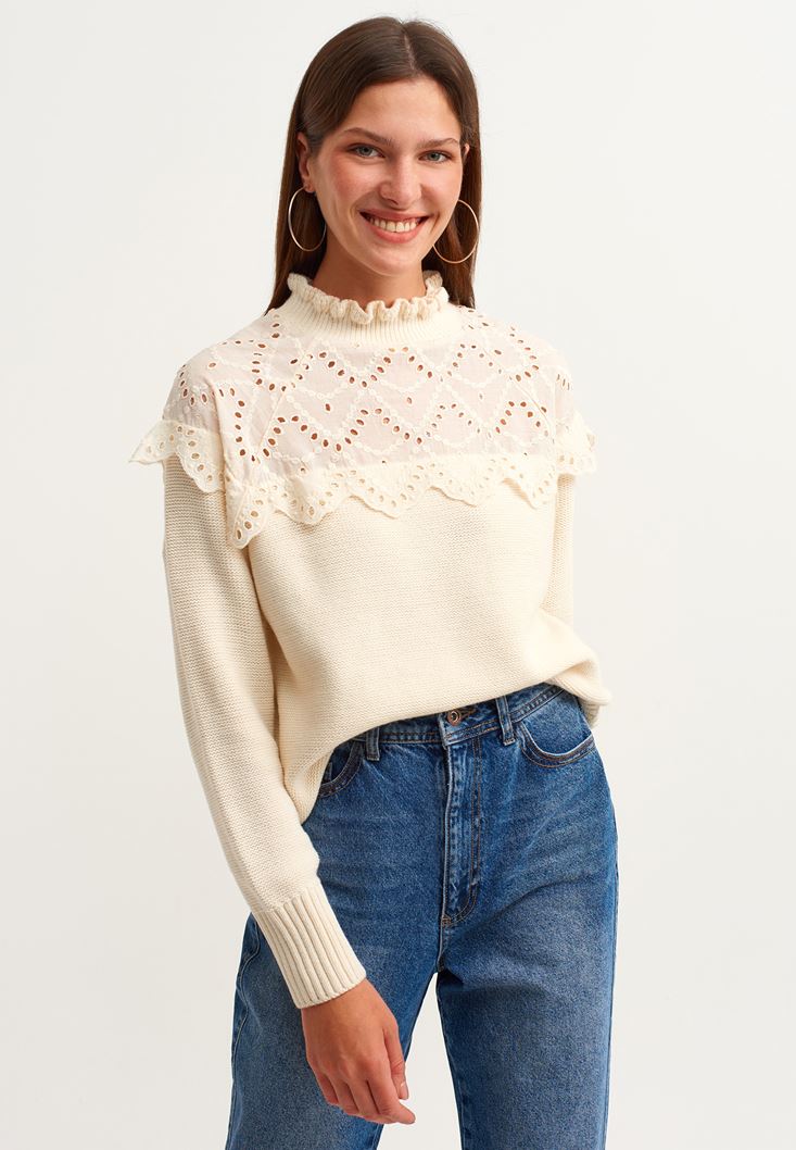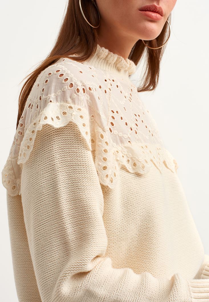 Krem Romantik Nakışlı Triko