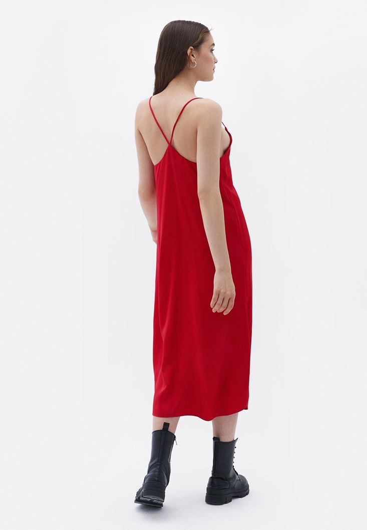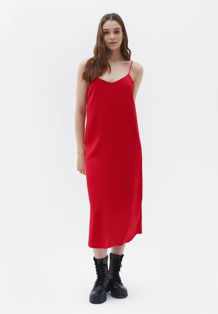 %100 viskon içerikli doku, saten görünüm, ince askılı, bedenden uzak fit, V yaka, sırt kısmı çapraz askılı, midi boy.