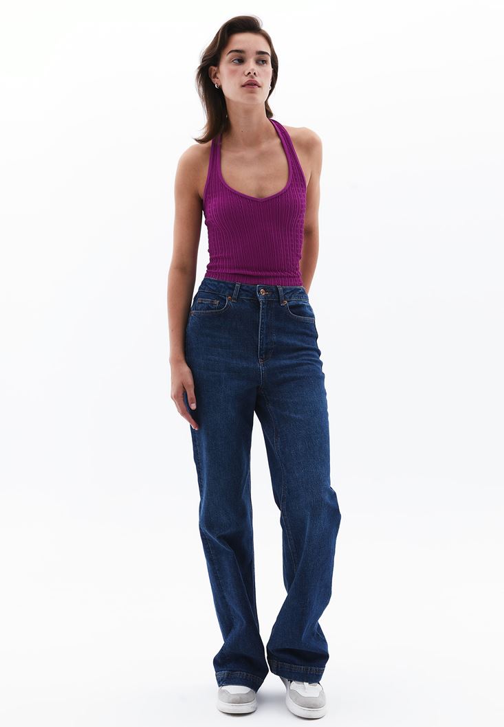 Bedeni saran esnek ve dikişsiz doku, V yaka, kalın askılı, crop kesim, seamless teknolojisi ile üretilen jakarlı doku, boyundan askılı.