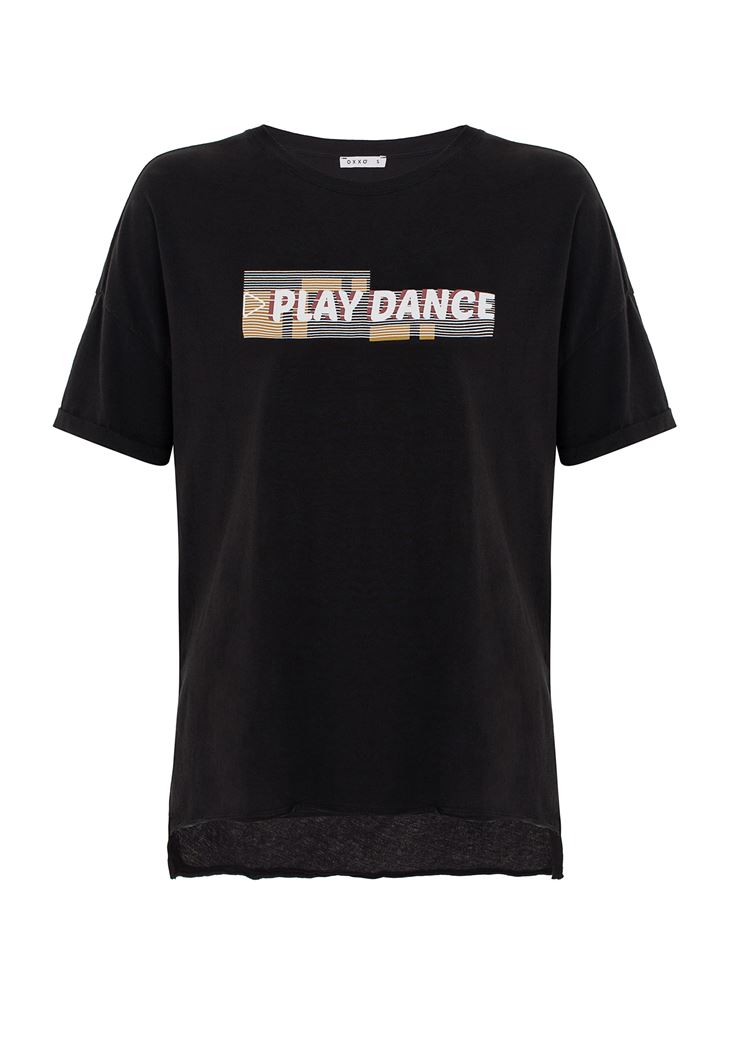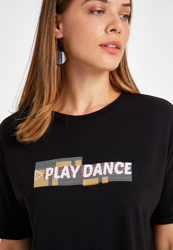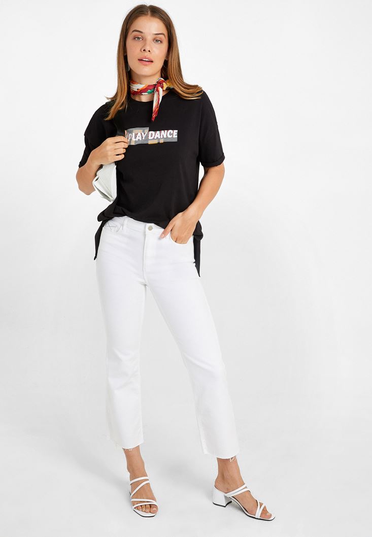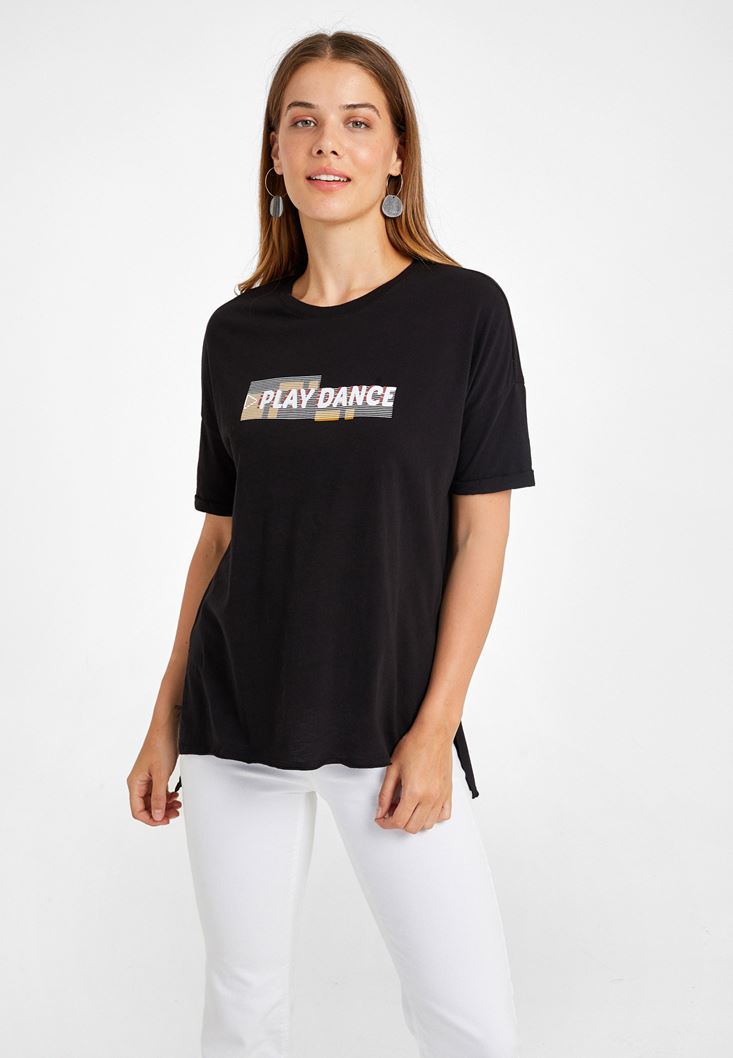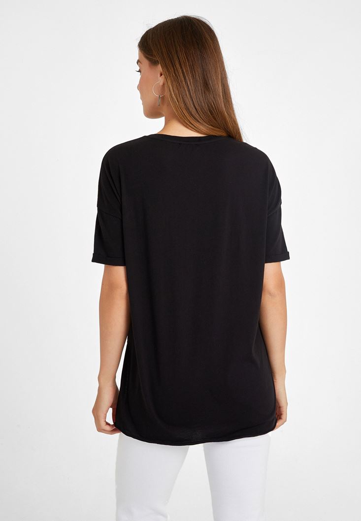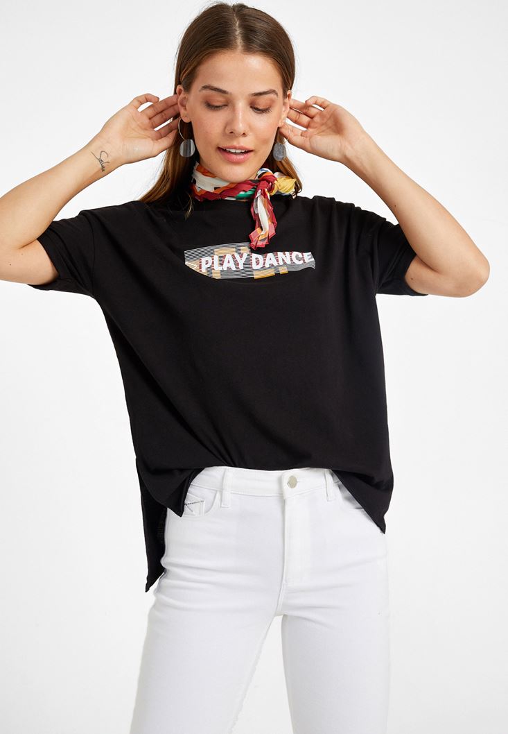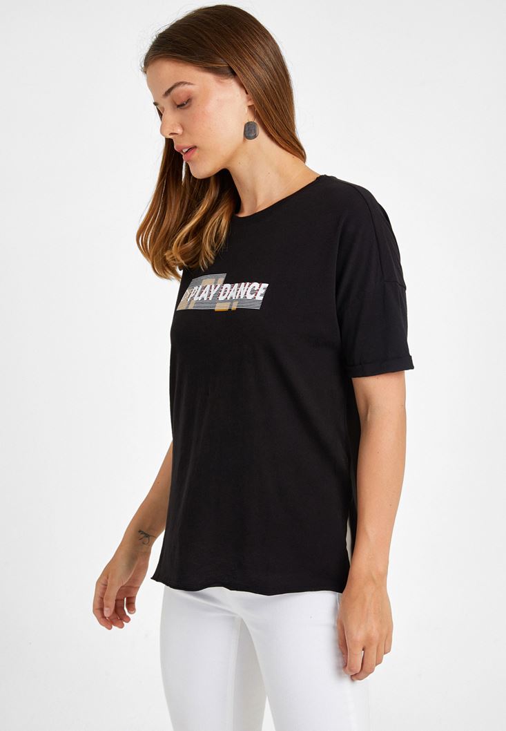 Siyah Sıfır Yaka Baskılı Boyfriend Tişört