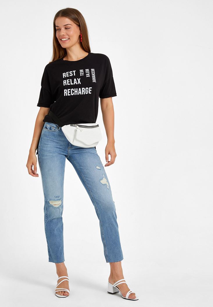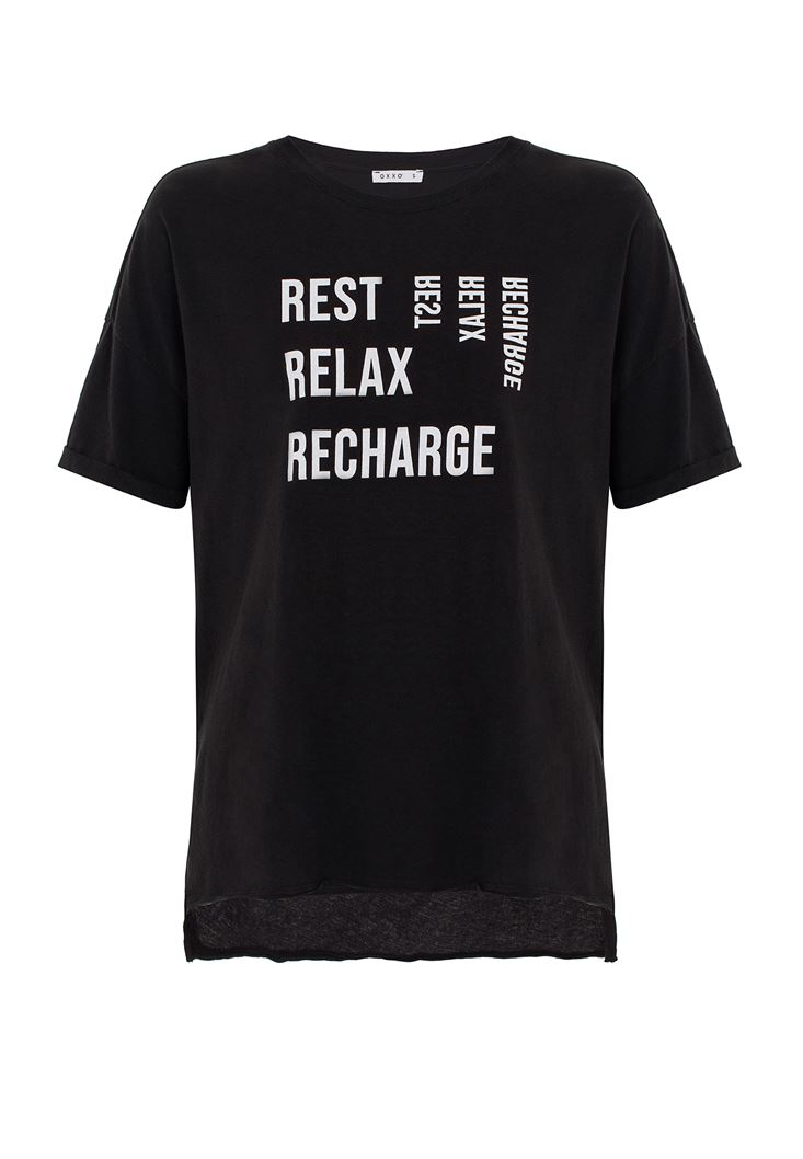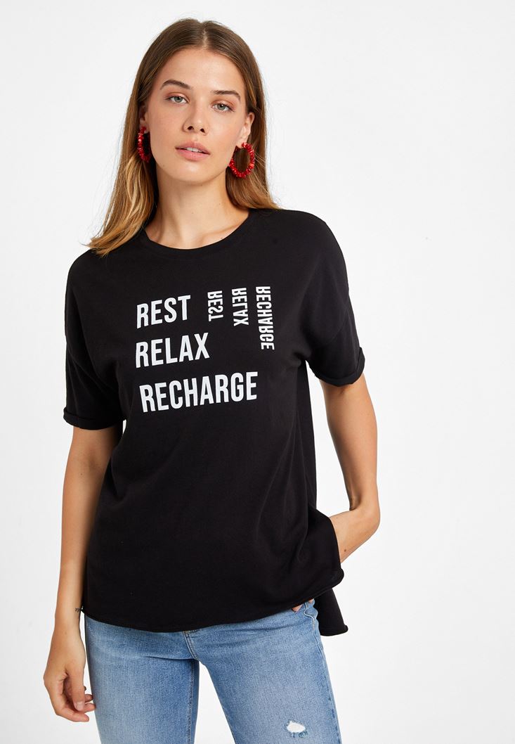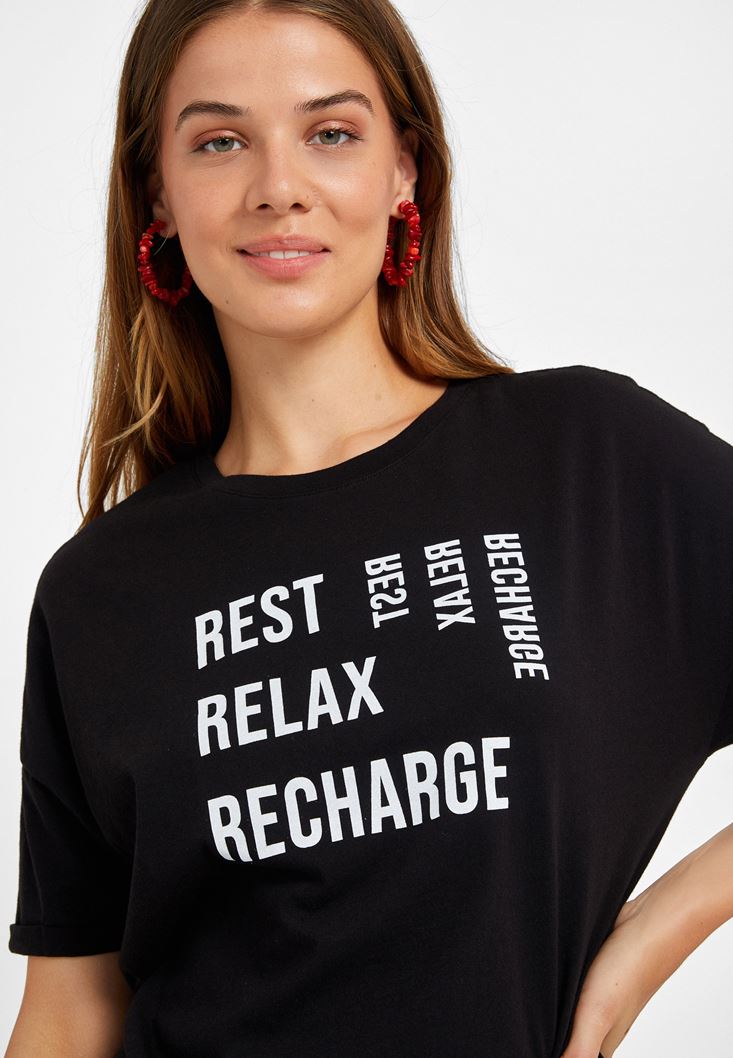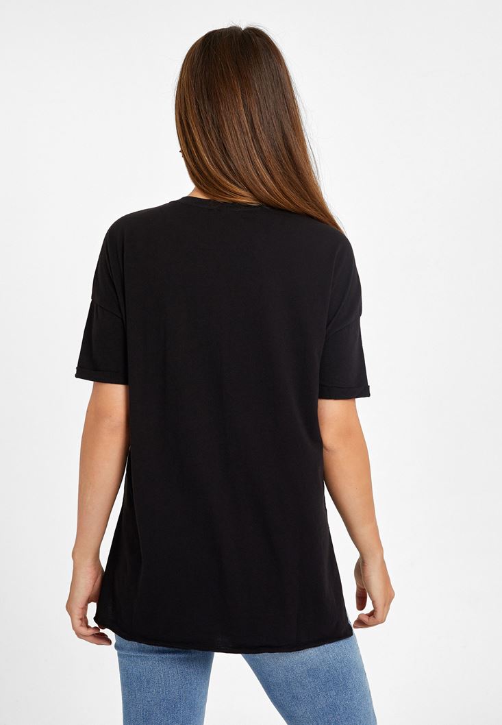 Siyah Sıfır Yaka Baskılı Boyfriend Tişört