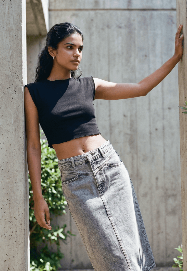 Pamuk karışımlı doku, bedeni saran esnek fit, kısa kollu, sıfır yaka, crop kesim.