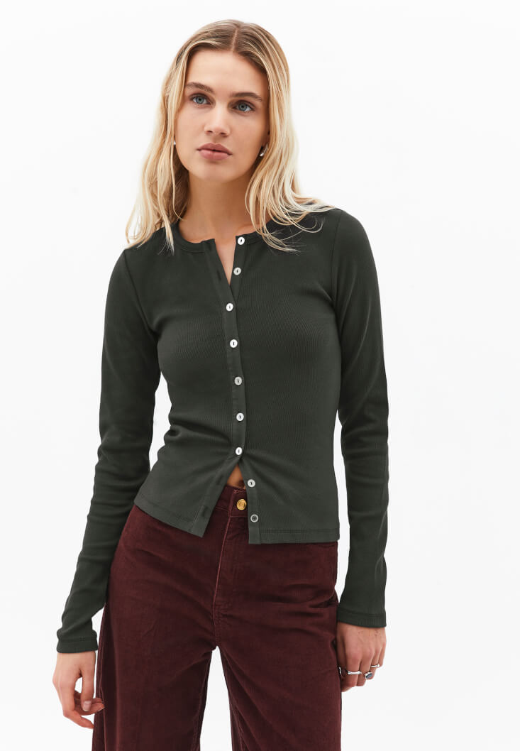 Pamuk karışımlı özel doku, düğme kapamalı, uzun kollu, sıfır yaka, bedeni saran esnek fit, jakarlı doku.