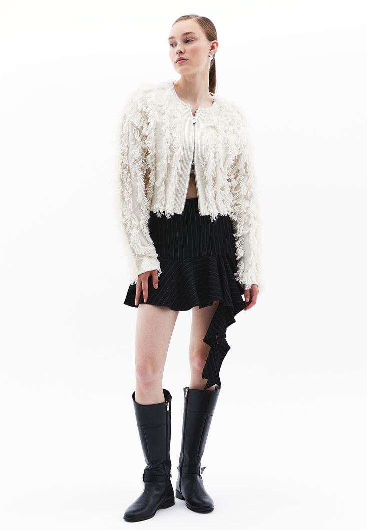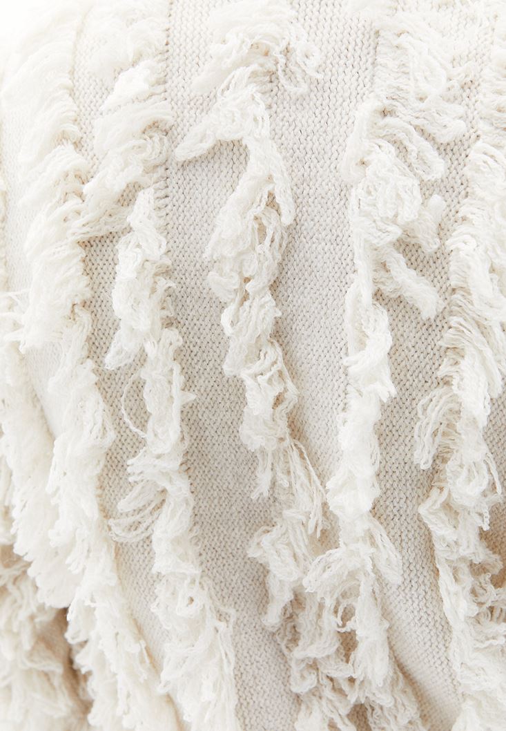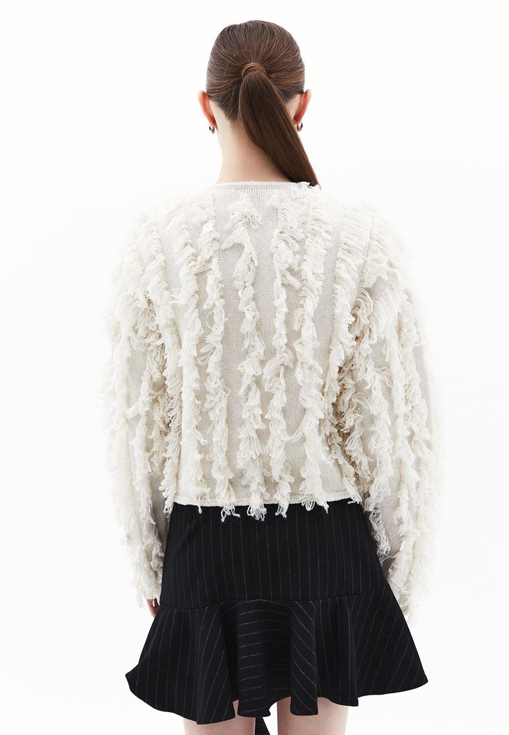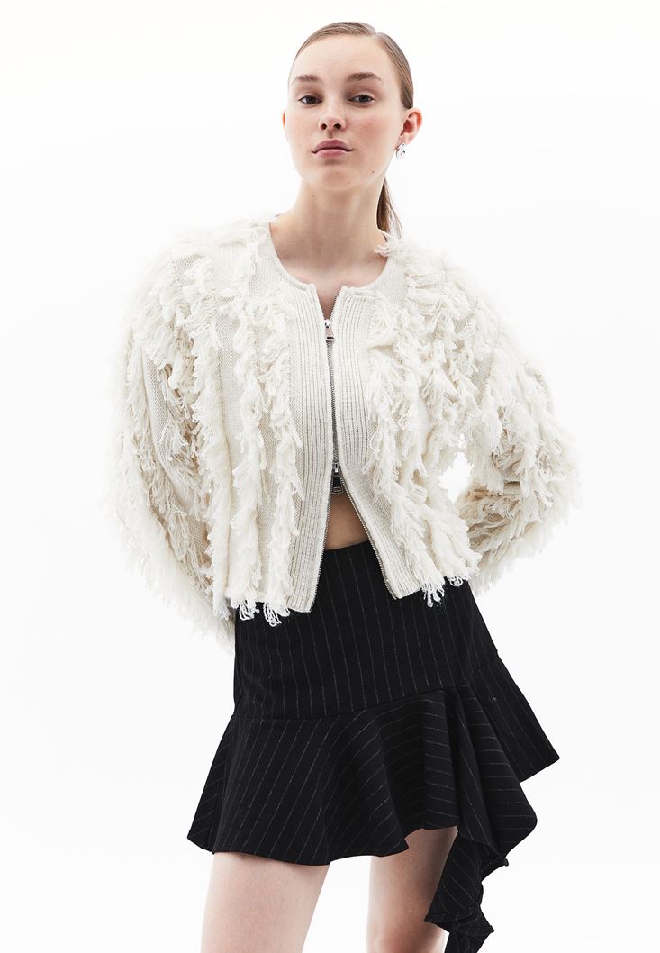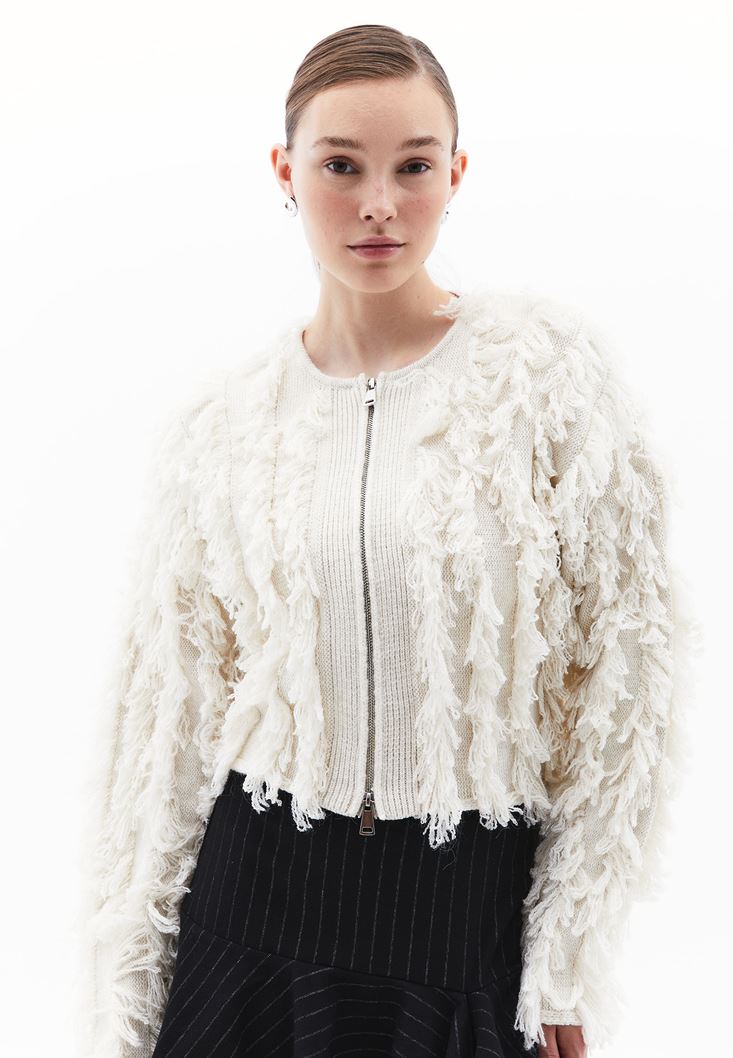 Saçaklı ve püsküllü triko örgü, bedenden uzak relax fit, uzun kollu, çift yönlü fermuar kapamalı, sıfır yaka.