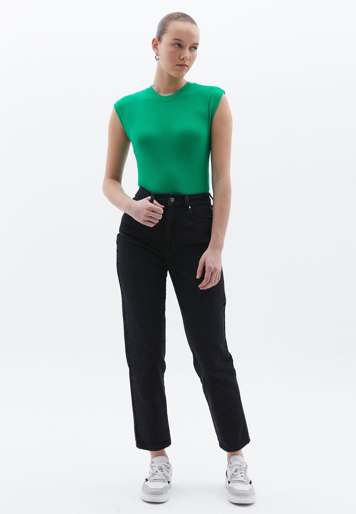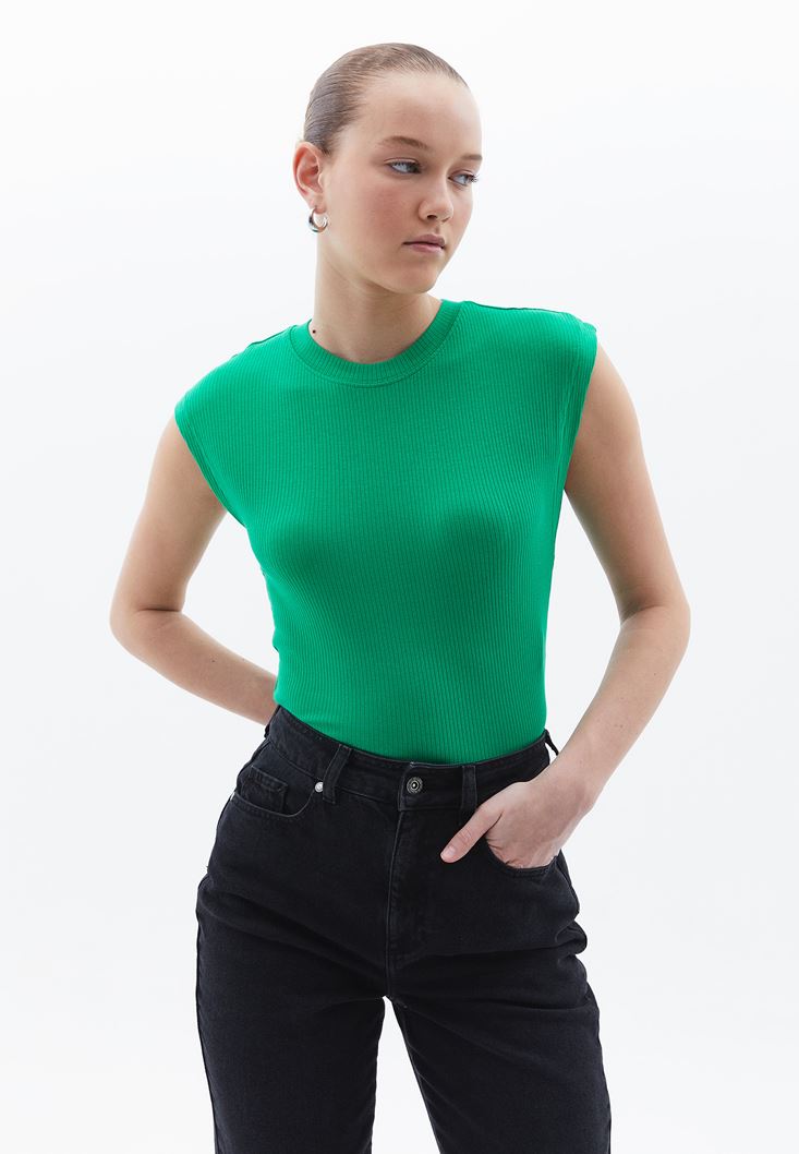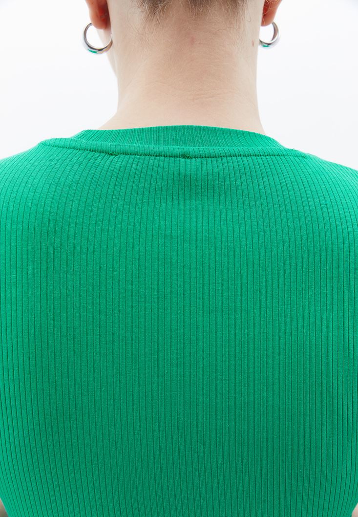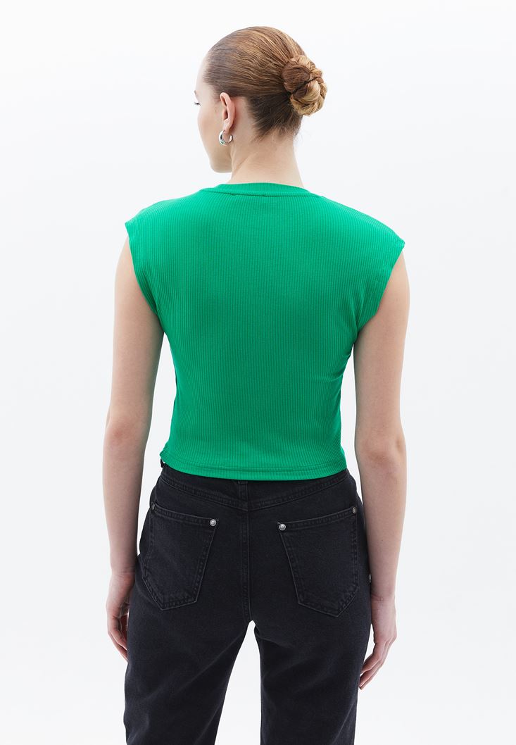 Modal ve pamuk karışımlı özel doku, bedeni saran esnek fit, crop kesim, sıfır yaka, kısa kollu.