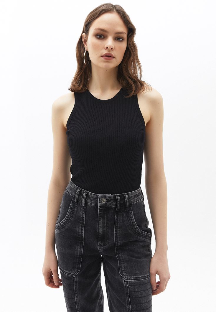 Fitilli triko, viskon içerikli doku, sıfır yaka, bedeni saran esnek fit, standart boy, kolsuz tasarım.