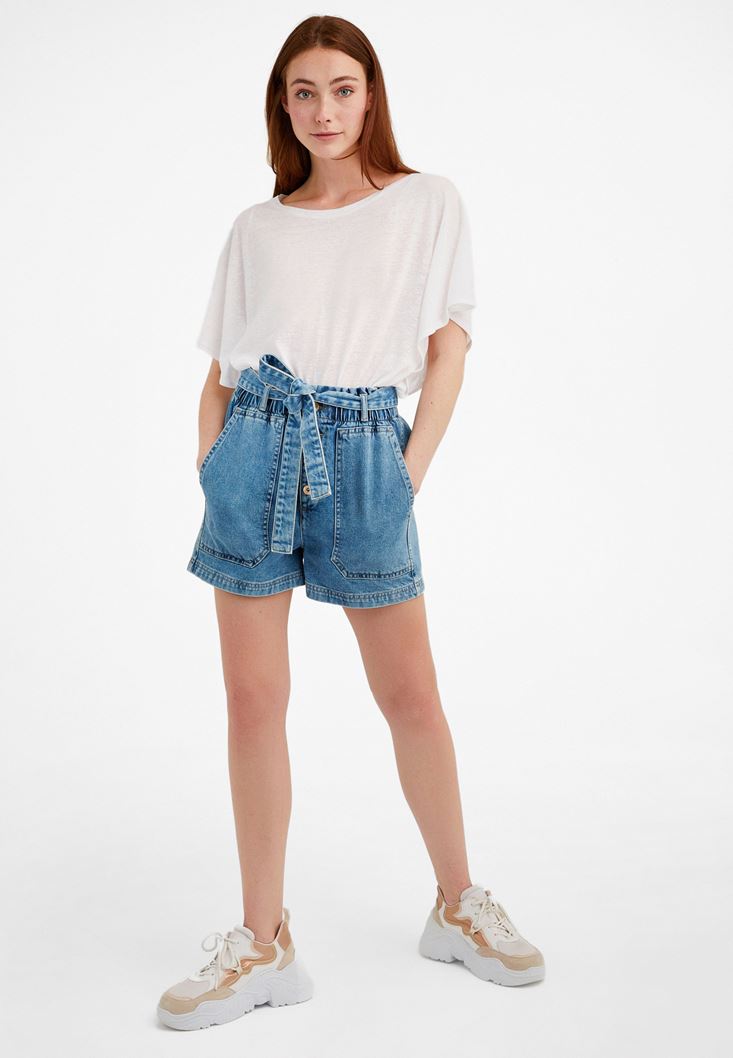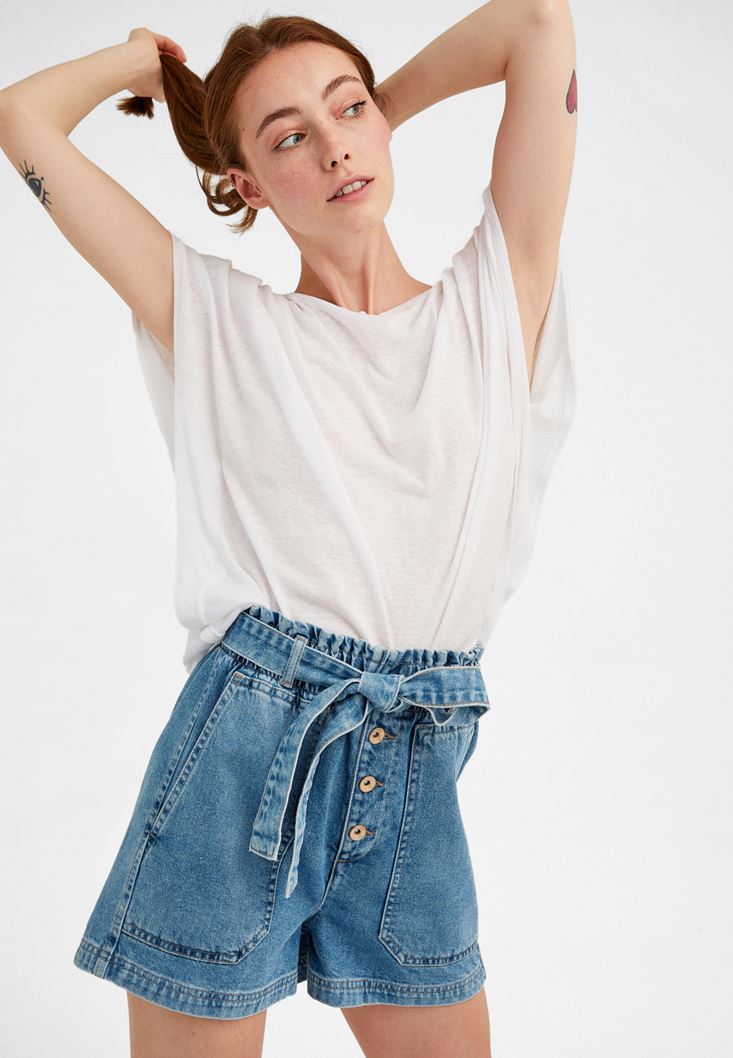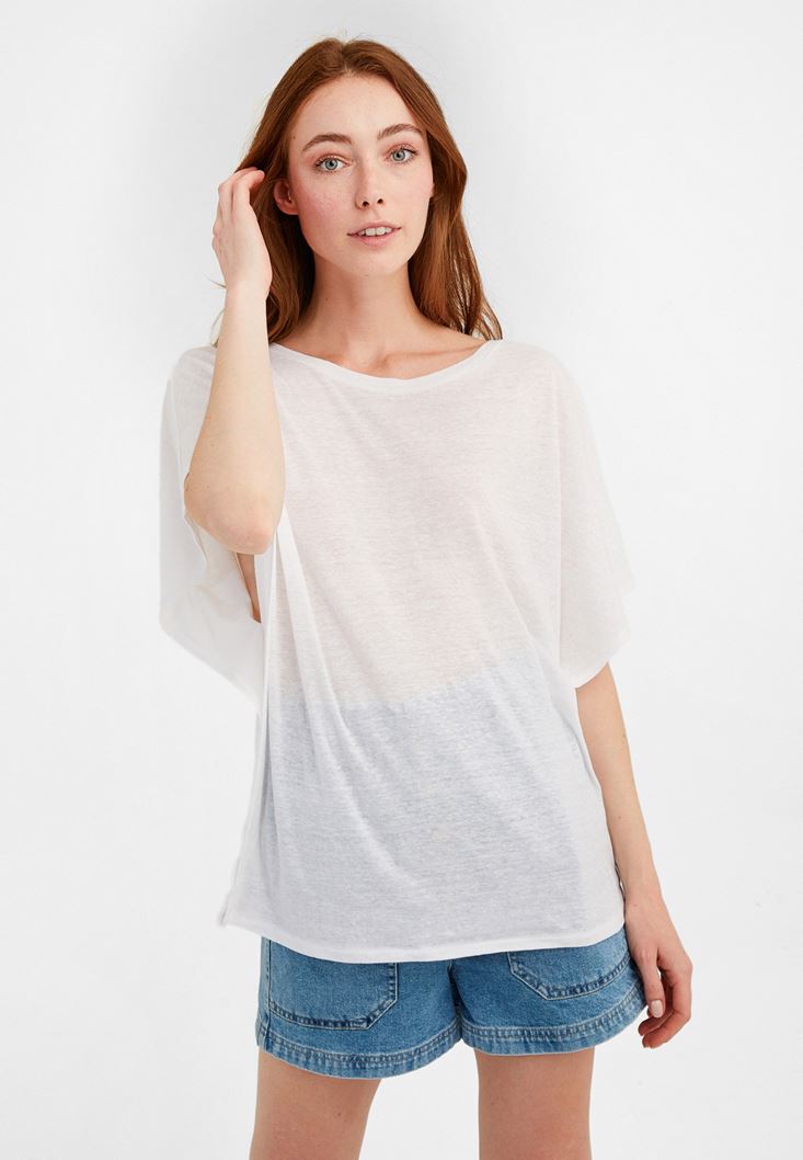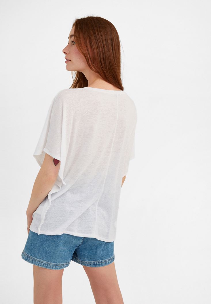 Beyaz Sıfır Yaka Volanlı Tişört