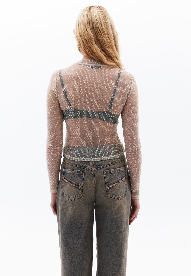 Bedeni saran esnek fit, desenli tül doku, uzun kollu, sıfır yaka, parıltılı sim detaylı.