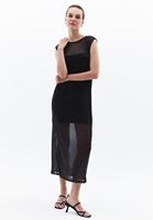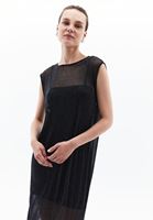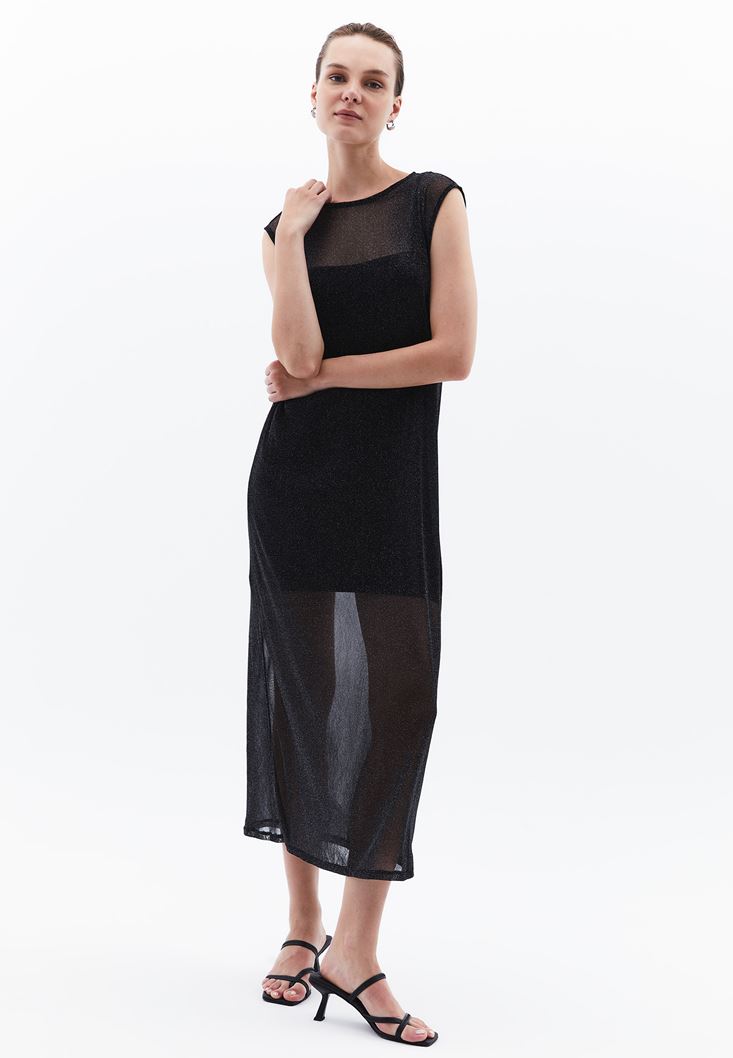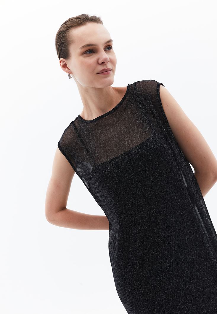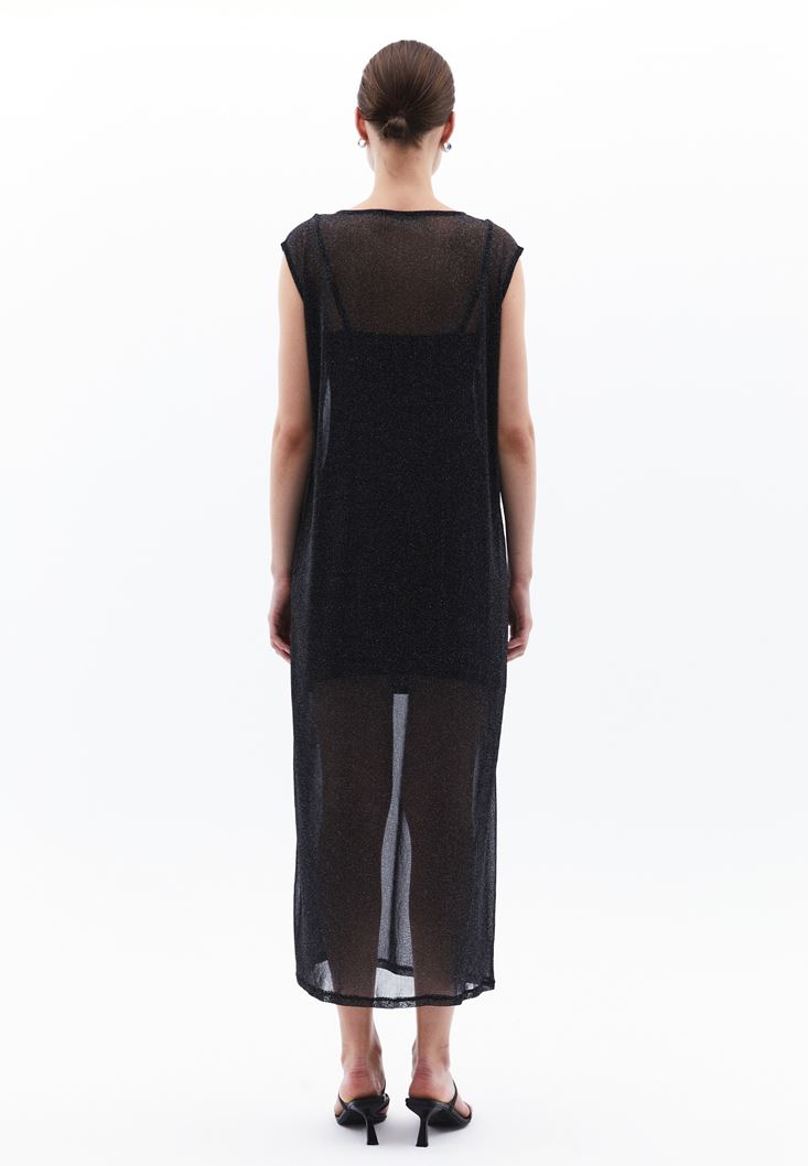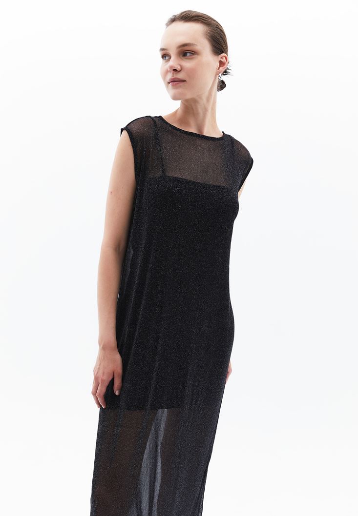 Transparan simli doku, bedenden uzak loose fit, içi askılı mini elbise astarlı, sıfır yaka, uzun kesim.