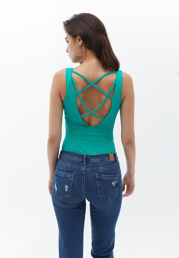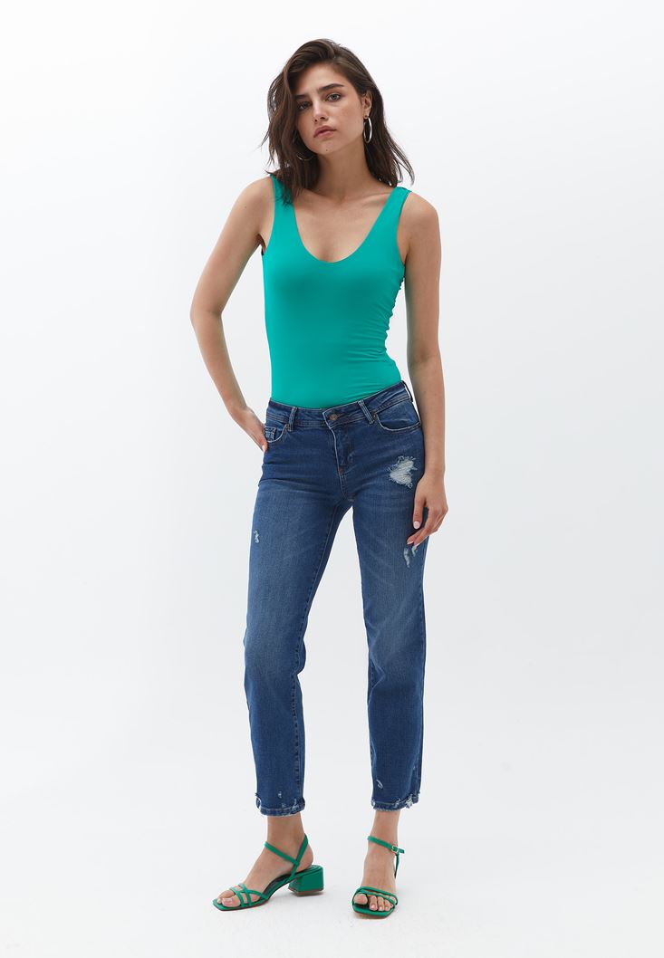 Sırt Dekolteli Bodysuit ve Mom Jean Pantolon Kombini