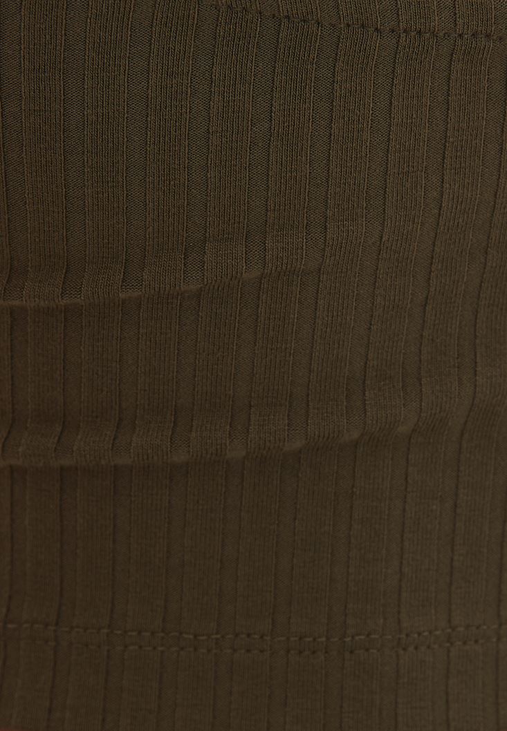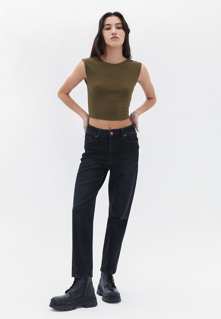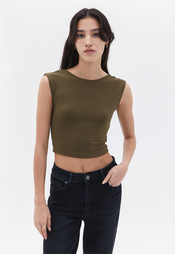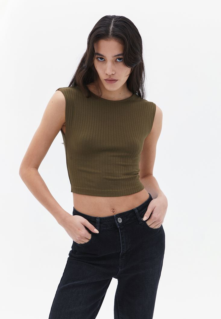 Viskon karışımlı doku, bedeni saran esnek fit, crop kesim, bot yaka, fitilli doku, sırt kısmı dekolteli.
