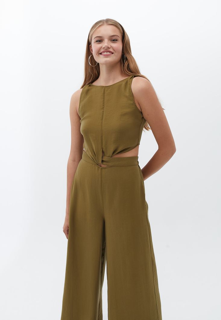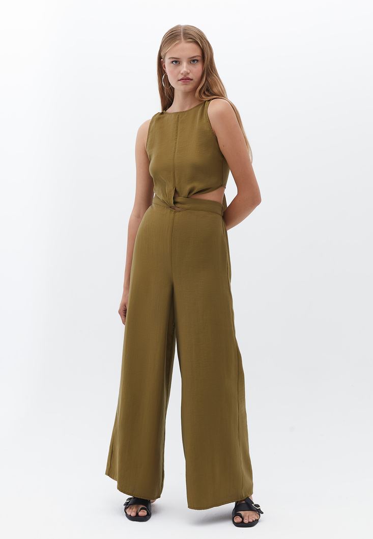 Tencel(Lyocell) içerikli geri dönüştürülebilir doku, sıfır yaka, bel kısmı burgu ve cut out detaylı, bol paça, ultra yüksek bel, sırt kısmı tek düğme kapamalı ve kuşak detaylı, arka bel kısmı lastikli.
