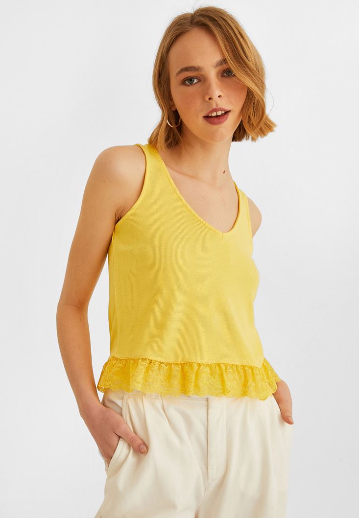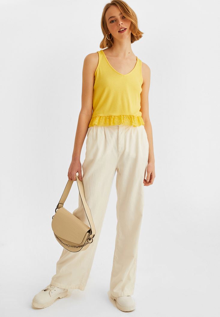 Dantel Detaylı Atlet modeli, viskon içerikli hoş dokusu ve zarif görünümü ile yeni sezona dahil oluyor. Kısa atlet modeli, V yaka kesimi ve sırt kısmında yer alan bağlama detayıyla Oxxo'da karşınıza çıkıyor. Dantel ayrıntısıyla da dikkat çeken kadın atlet modeli, tarzınıza zarafet katmanız için uygun bir seçenek olarak sizlerle buluşuyor. Kısa atlet modelini, jeanlerle veya mini eteklerle bir araya getirerek kombin oluşturabilirsiniz. Oxxo'nun benzersiz ayrıntılarla ve dokularla sizlere sunduğu kadın atlet modelleri ile tarzınızı dilediğiniz gibi yansıtabilirsiniz.
