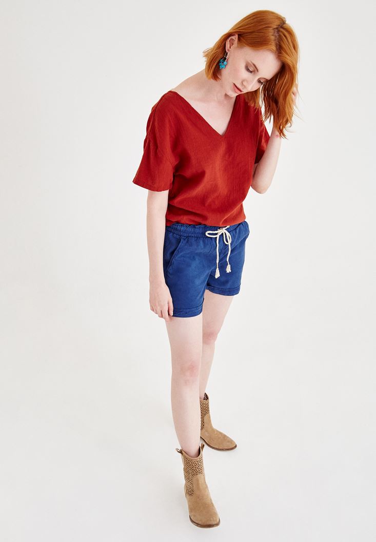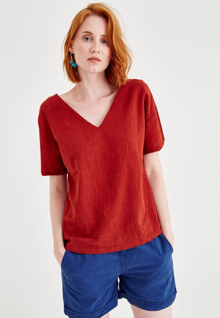Sirt Detayli Keten Bluz modeli yumusak dokusu, zarif detaylari ve her zaman severek kullanacaginiz sade durusu ile dikkat çeken bluz modelleri arasinda yer aliyor. Pamuk ve keten dokunun muhtesem birlesimi ile oldukça yüksek kullanim konforu sunan keten bluz modeli ile farkli tarzlarda kombinler yapmanin tadini çikaracaksiniz. Derin V yaka kesimi ve bu kesimle simetri olusturan sirt dekoltesi ile oldukça hos bir görünüme sahip olan bluz modelini pek çok kombinde rahatlikla kullanabilirsiniz. Keten dokunun serin tutan yapisi ve pamuk dokunun nem emiciligi sayesinde en hareketli günlerinizde rahat etmenize yardimci olacak keten bluz modeli, OXXO'nun enerjisi ve konforu yüksek bluz modellerinden birisi.