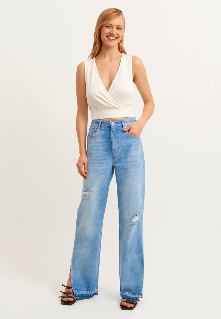 • Bayan Krem Sırt Detaylı Kruvaze Crop Bluz