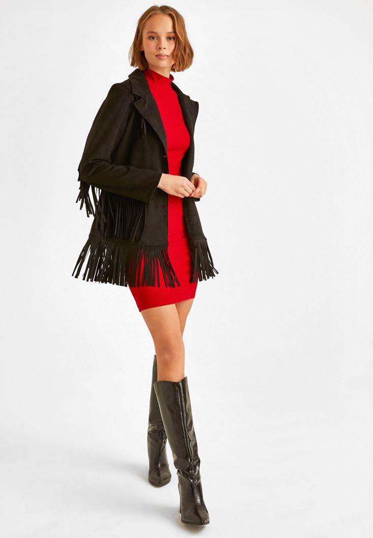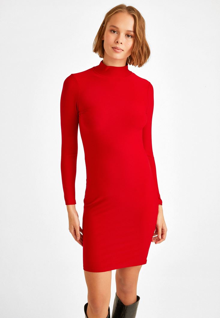 • Bayan Kırmızı Sırt Detaylı Uzun Kollu Elbise