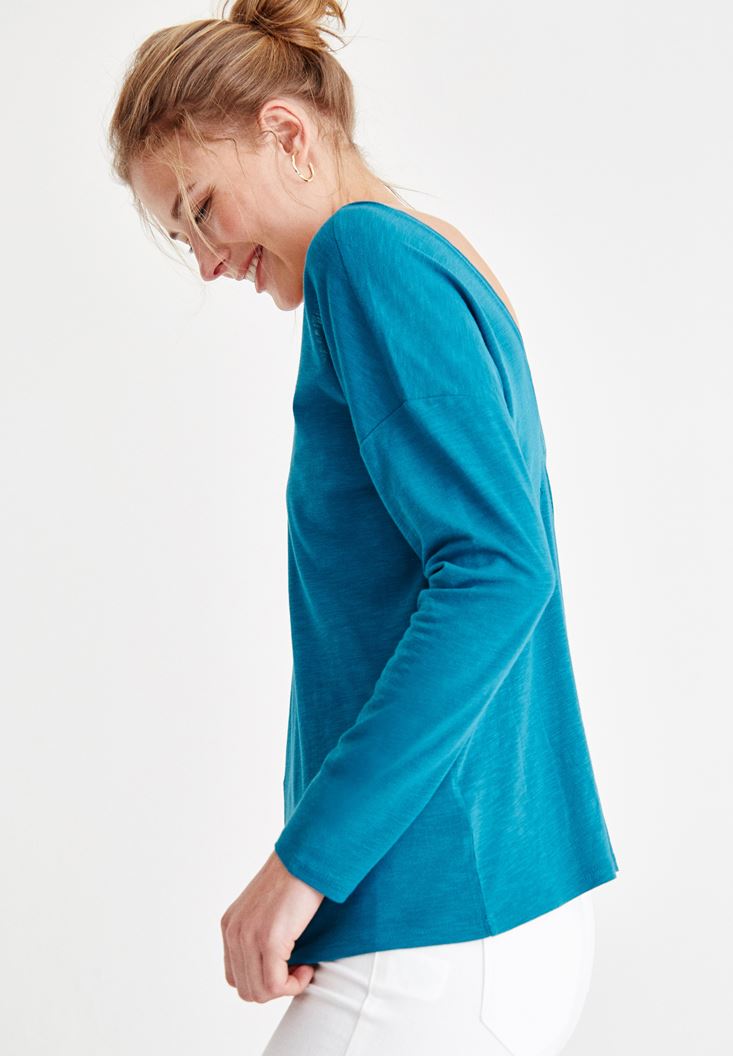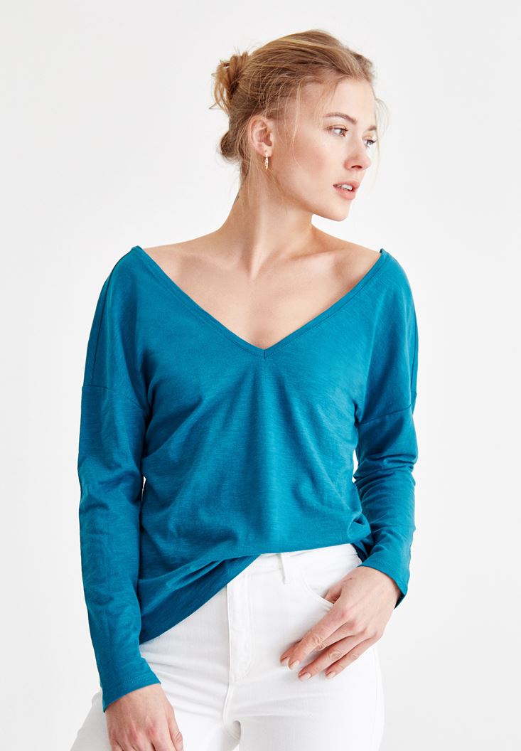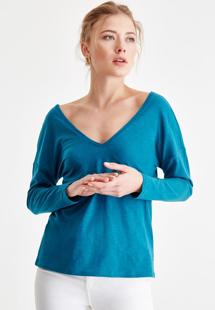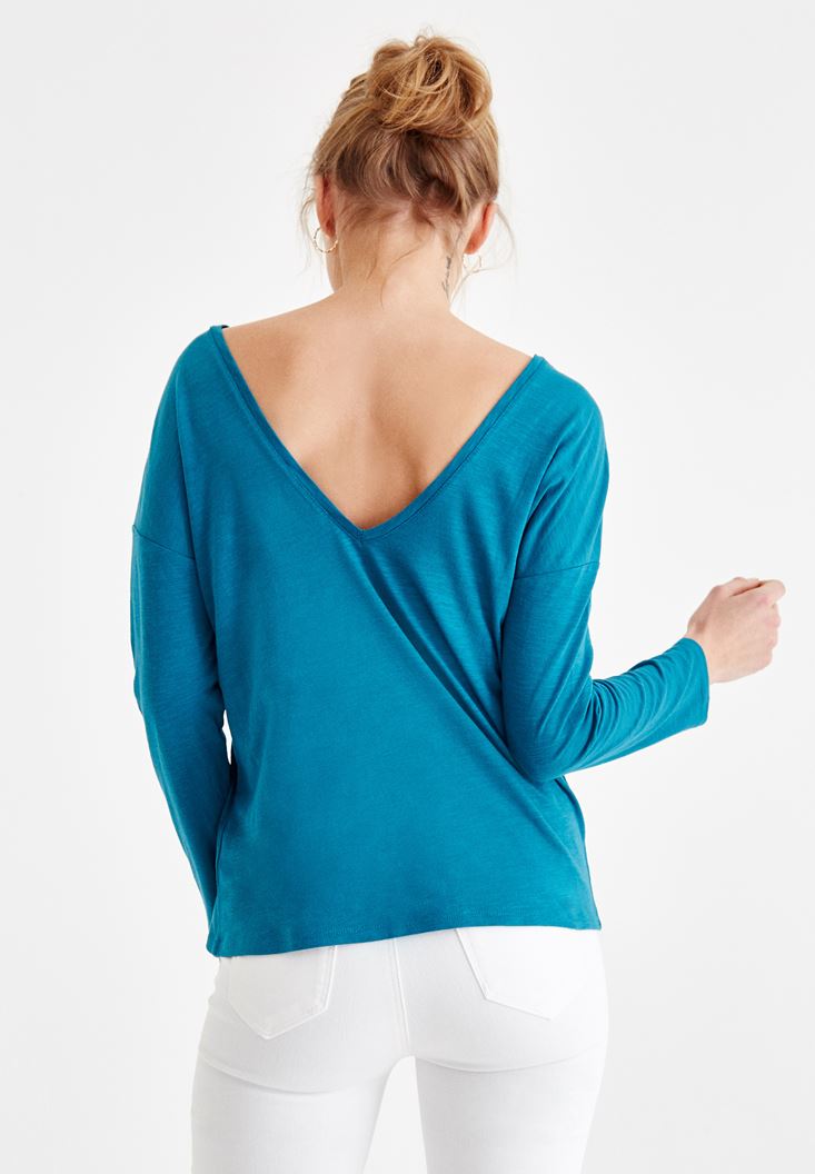 • Bayan Mavi Sırt Detaylı V Yaka Tişört